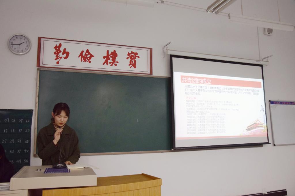 此次团校培训大会由组织部部长胡林雨主持。活动伊始,组织部副部长杨慧莹向大家介绍会议的基本内容并向大家详细介绍了团旗、团徽及其象征意义,并讲解了共青团的成立历程。接着组织部副部长卢淑娟带领同学们对团章内容进行学习,明确团员身份、明晰责任义务、明了历史使命。