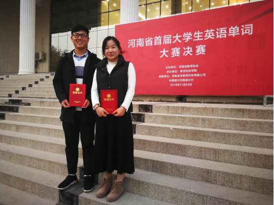 河南省翻译协会组织了河南省首届大学生英语单词大赛,分初赛、复赛和决赛三个阶段。初赛和复赛以线上“积分赛+普惠赛”的形式已于2018年6月11日-26日先期举行,全省138所高校的近9万名本、专科学生参加了本阶段的比赛。经过初赛和复赛,全省有105名选手晋级决赛,分为三个组别:A类:全省本科非英语专业选手50人;B类:全省本科英语专业选手25人;C类:全省专科专业选手30人。我校外国语学院15级口译班马苏双和15级经贸班乔文华进入B类本科英语专业决赛环节,并在2018年11月24日在黄河科技学院举行的决赛中,双双荣获二等奖。15级笔译班李霁芳、15级经贸班田德生和邰亚奇三位学子也分获三等奖。