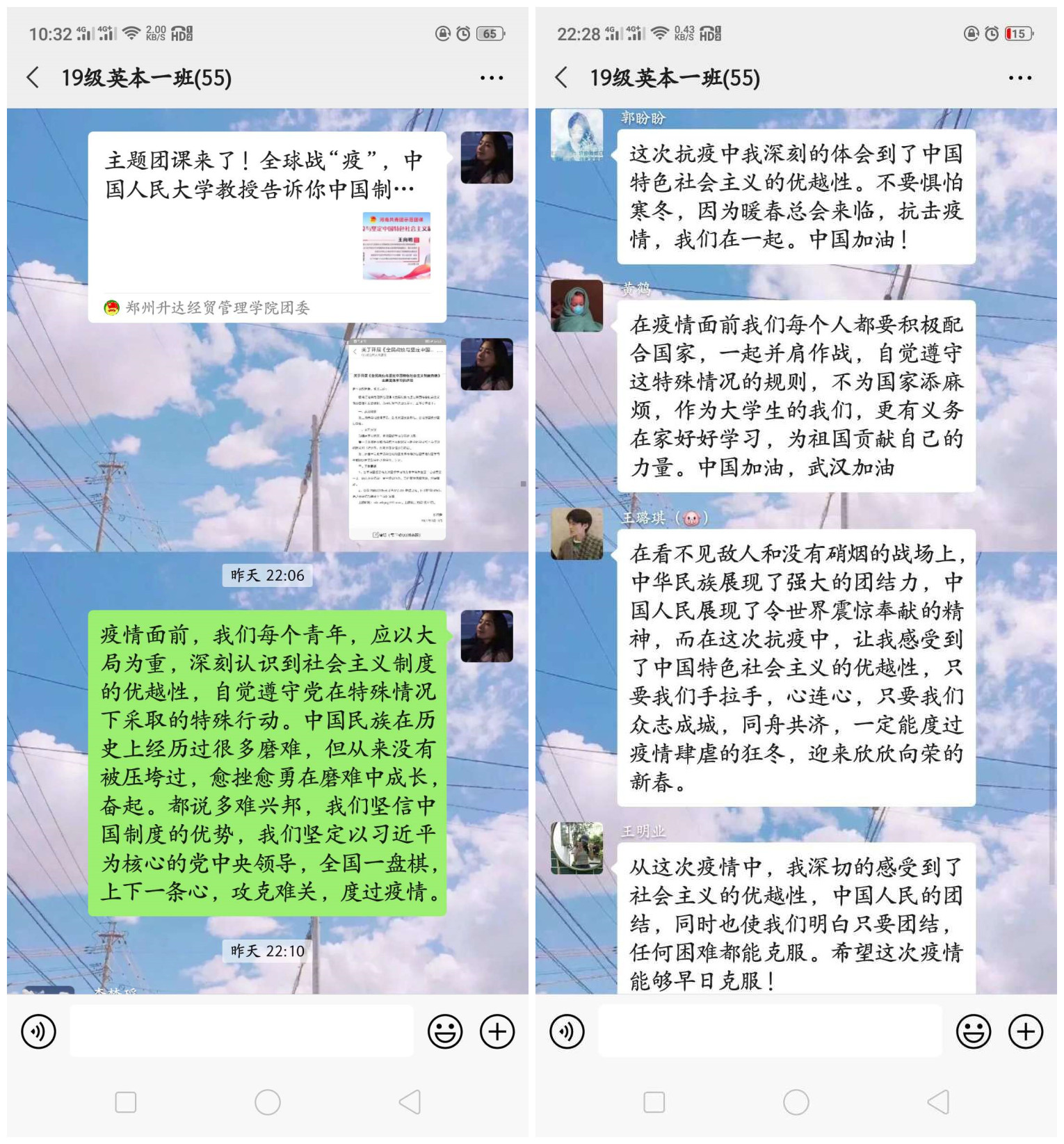 同学们认真观看,热烈讨论,纷纷发言。18级商英本1班团支书张娜娜说:面对疫情的大考,作为青年的我们心系国家的安危。中国人再次表现出强大的团结力量,共同抗击疫情,我们国家社会主义制度的优势也在逐步显现。高效建起数座方舱医院,仅仅是中国这段时间抗击疫情的一个缩影。通过本次团课学习我了解到,与其他国家相比,“中国速度”何以如此之快?“中国力量”何以如此之强?答案就在于体现人民意志、保障人民权益、激发人民创造活力的中国特色社会主义的制度优势。上下同欲,则无往而不胜。相信,我们国家能够充分发挥独特制度优势战胜疫情。