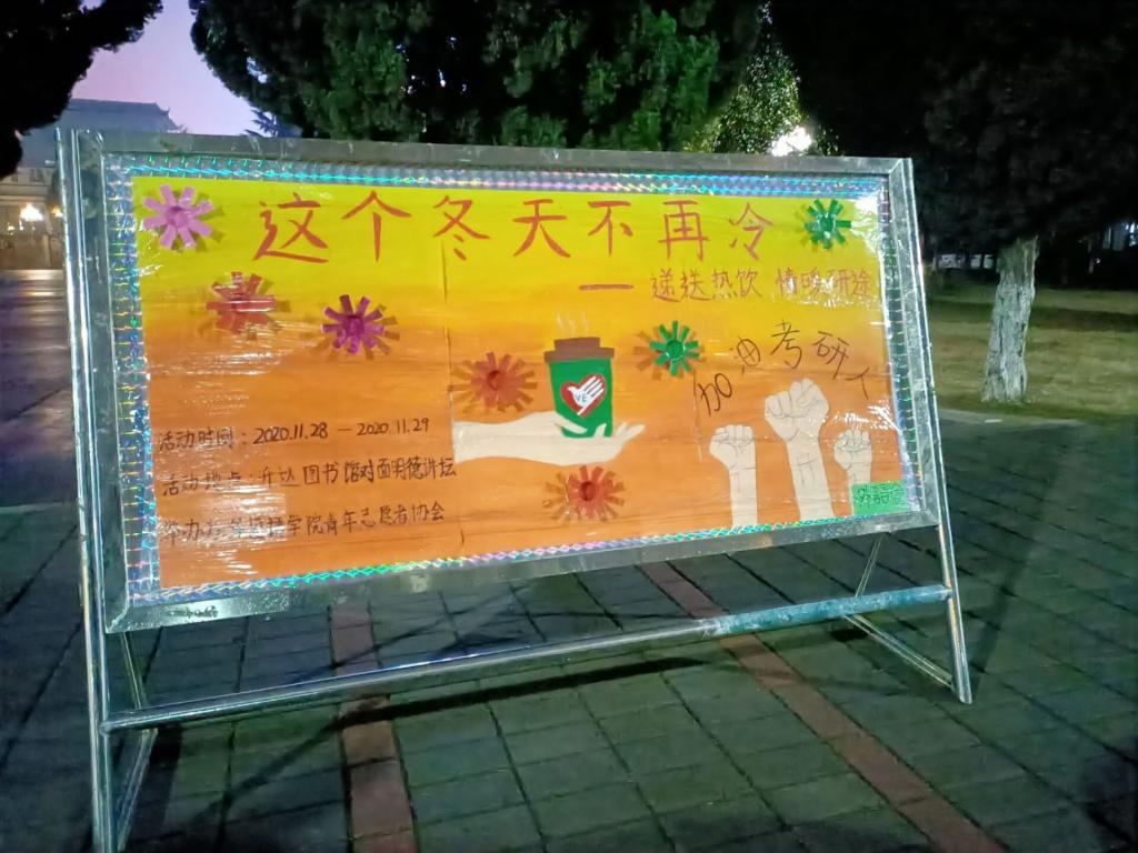 2020年11月28日8:00--17:00,由外国语学院青年志愿者协会举办的“这个冬天不再冷”暖心热饮活动在明德广场成功举行。此次活动是外国语学院志愿传递爱心的项目之一,青年志愿者协会全体成员亲手为考研人递送暖心热饮。