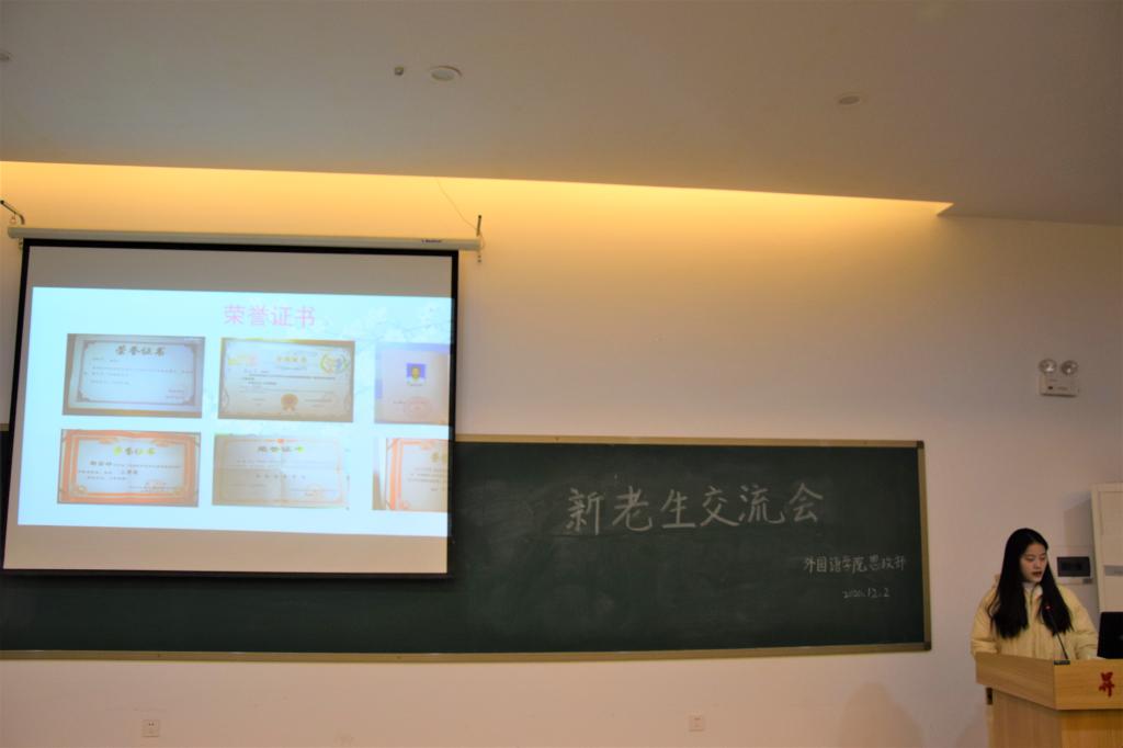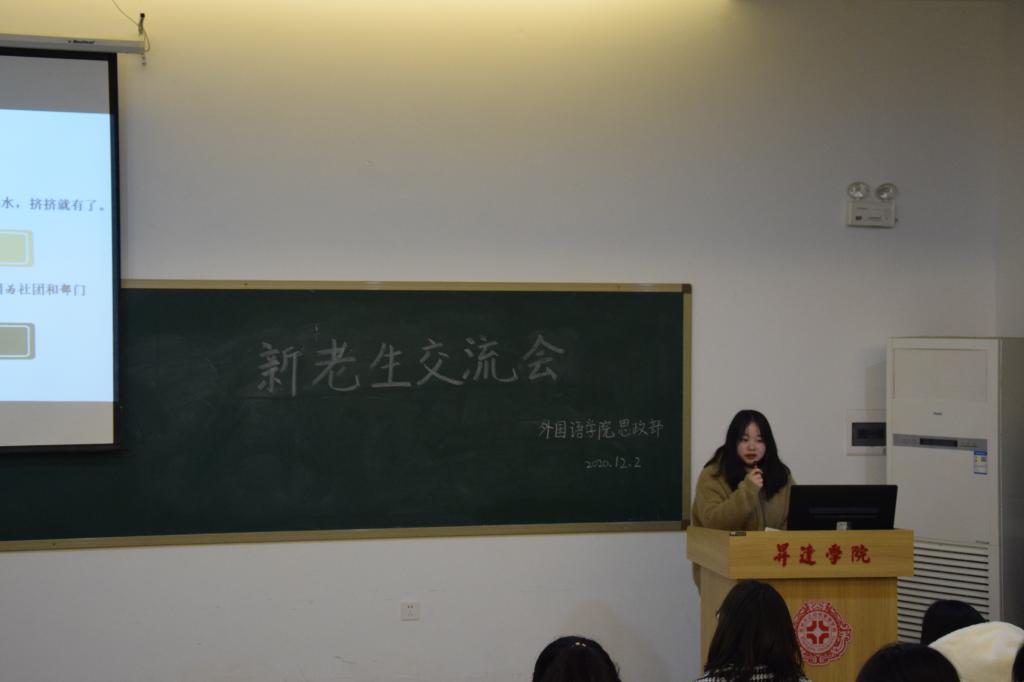 为加强新老生之间的联系,让新生们更好的了解大学生活,把握学习规律,更好的适应大学生活,外国语学院团委思政部于2020年12月2日在教1楼208教室举办了业余团校的第三次培训:新老生交流会,邀请优秀学长学姐分享有关生活、学习、工作、竞赛等方面的宝贵经验。