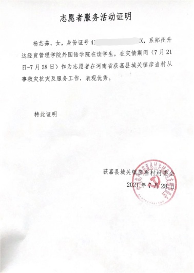 7月21日当晚,新乡突发强暴雨,造成严重内涝。灾难发生后,杨芯茹第一时间积极响应当地村委会的号召,投入到家乡获嘉县城关镇扬彦当村的救援活动中,为灾民搬运物资,防止附近村民靠近危险区域,帮助施工人员装沙袋,搬沙袋等等。在持续八天的志愿活动中,杨芯茹不辞辛劳,竭尽所能,得到彦当村村委会的一致肯定。