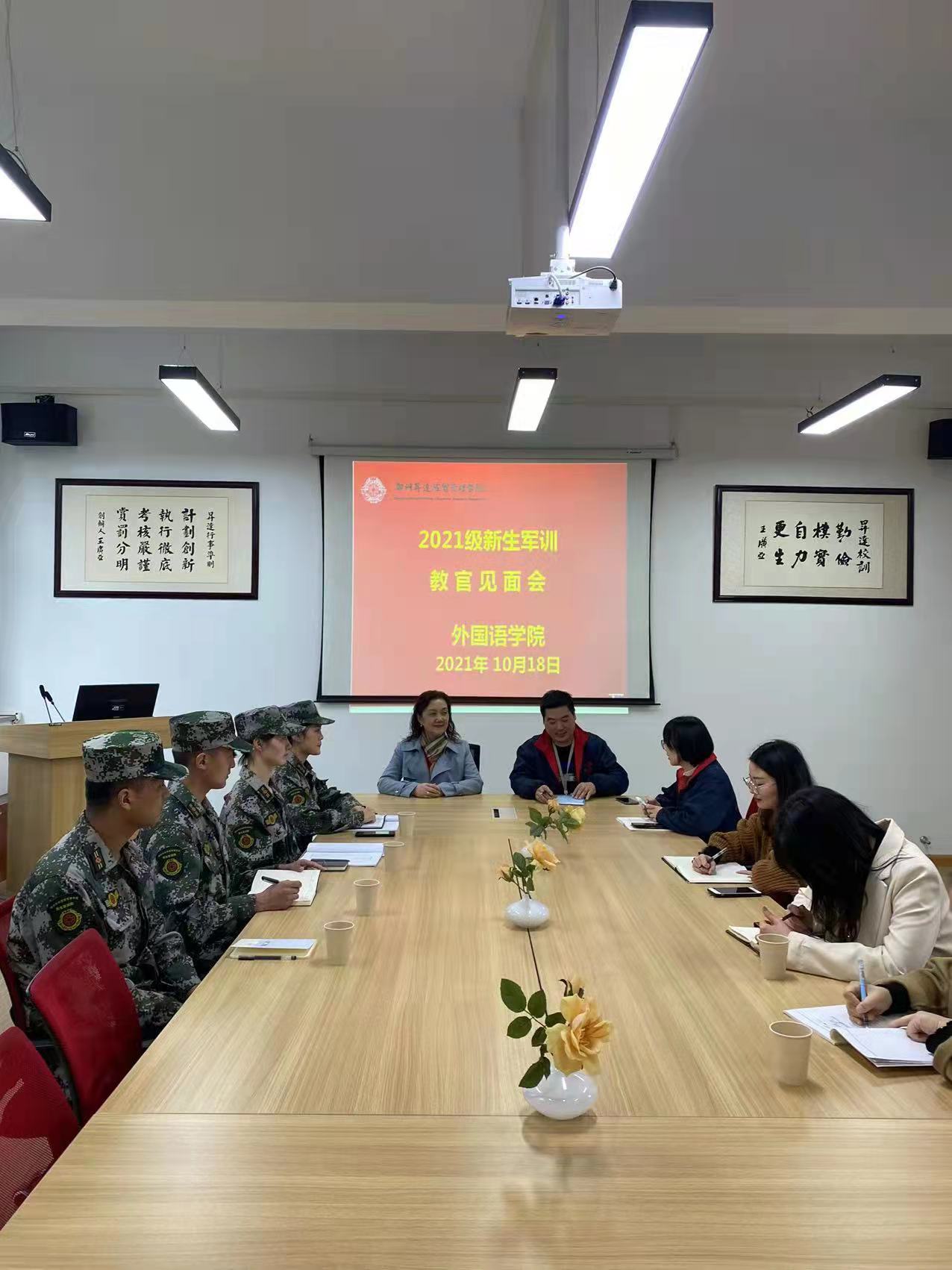 为了深入推进我院新生军训工作取得实效,10月18日下午,外国语学院组织召开了2021级新生军训工作专题会。外国语学院院长张梦教授、院党委书记石皓召同志、行政秘书丁玥老师及新生班辅导员、新生军训教官等出席本次活动。会议由行政秘书丁玥老师主持。