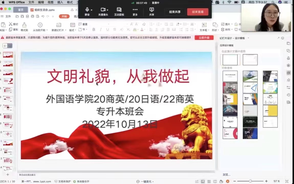 为推进文明校园建设,进一步提升生学文明礼仪素养,积极构建和谐文明校园。10月13日,外国语学院20商英本1/2班,20日语本1/2班,22级商务英语专升本班,在辅导员崔艳婷老师组织下,召开“文明礼貌从我做起”线上班会。