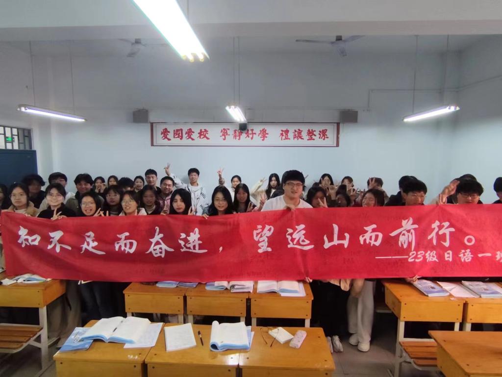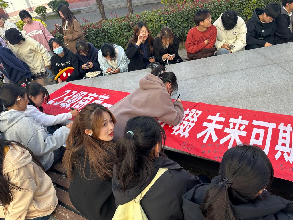 为了彰显“好学月”主题,加强班级凝聚力、向心力,12月8日下午1点,2023级商务英语本科1班、2班、2023级日语本科1班学生以班级为单位,分别在教学1号楼、综合楼、升达操场举办横幅签名祝福语活动。
