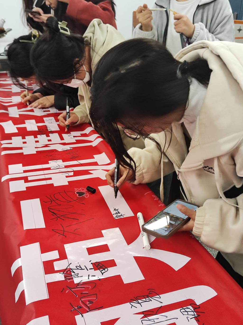 本次签名活动策划已久,同学们积极选取班级口号,选取合适的时间地点,认真组织签名活动。鼓励同学们在横幅上写下自己对未来的理想、期盼和祝福,并签下自己的个性签名。在签名结束后,同学们进行了集体合照留影。