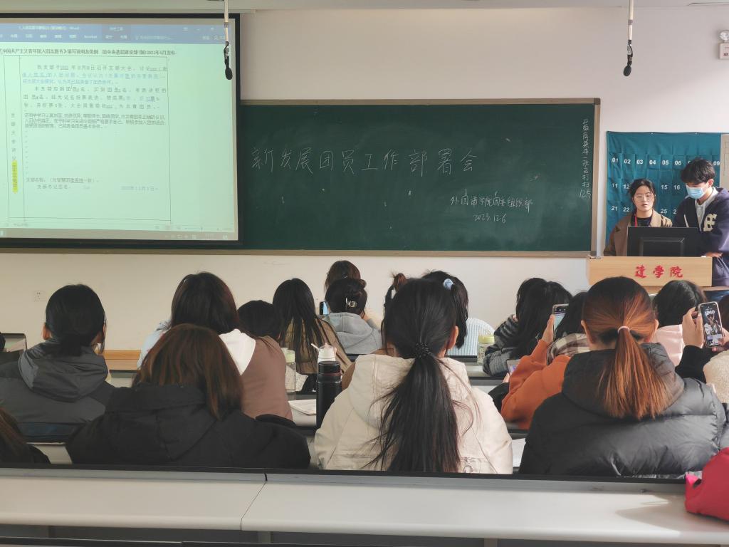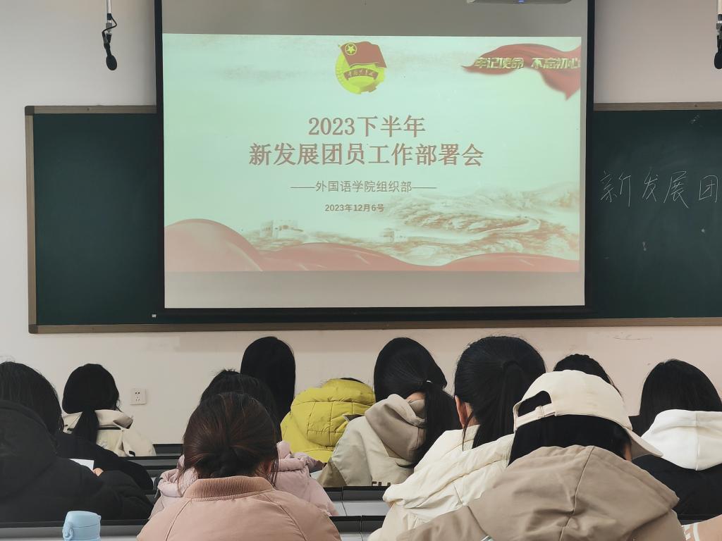 2023年12月6日,外国语学院团委组织部在教一楼109教室举办了新发展团员工作部署会,为了进一步推动共青团的发展,培养更多优秀的青年人才,我院对发展新团员工作进行了全面部署。此次工作的目的是激发青年学生的积极性,帮助他们更好地融入共青团这个大家庭,实现个人价值。