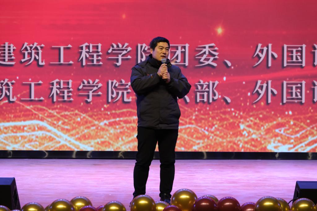 为了纪念一二·九运动,弘扬爱国主义精神,为中华民族的伟大复兴贡献力量,外国语学院团委联合建筑工程学院团委于2023年12月13日晚在思源会馆联合举办了一场精彩纷呈的一二·九晚会。外国语学院党委书记石皓召书记、建筑工程学院副院长高燕老师、校团委副书记李雷老师、会计学院团委书记陈刚老师、外国语学院团委书记丁玥老师、建工学院团委书记支园园老师、校团委社团文体部负责人马悦老师、校团委宣传部负责人马鹏老师及外国语学院和建筑工程学院各位辅导员出席了本次活动。