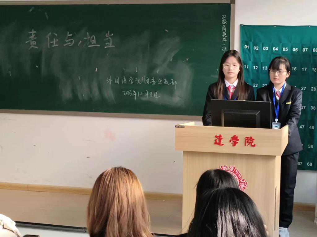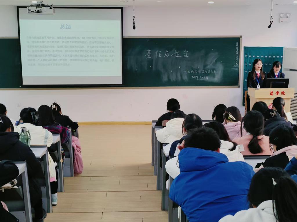 为了增强学生的社会责任感和担当意识,外国语学院团委思政部于2023年12月15日在教学一号楼109教室举办了一场以“责任与担当”为主题的团课活动。