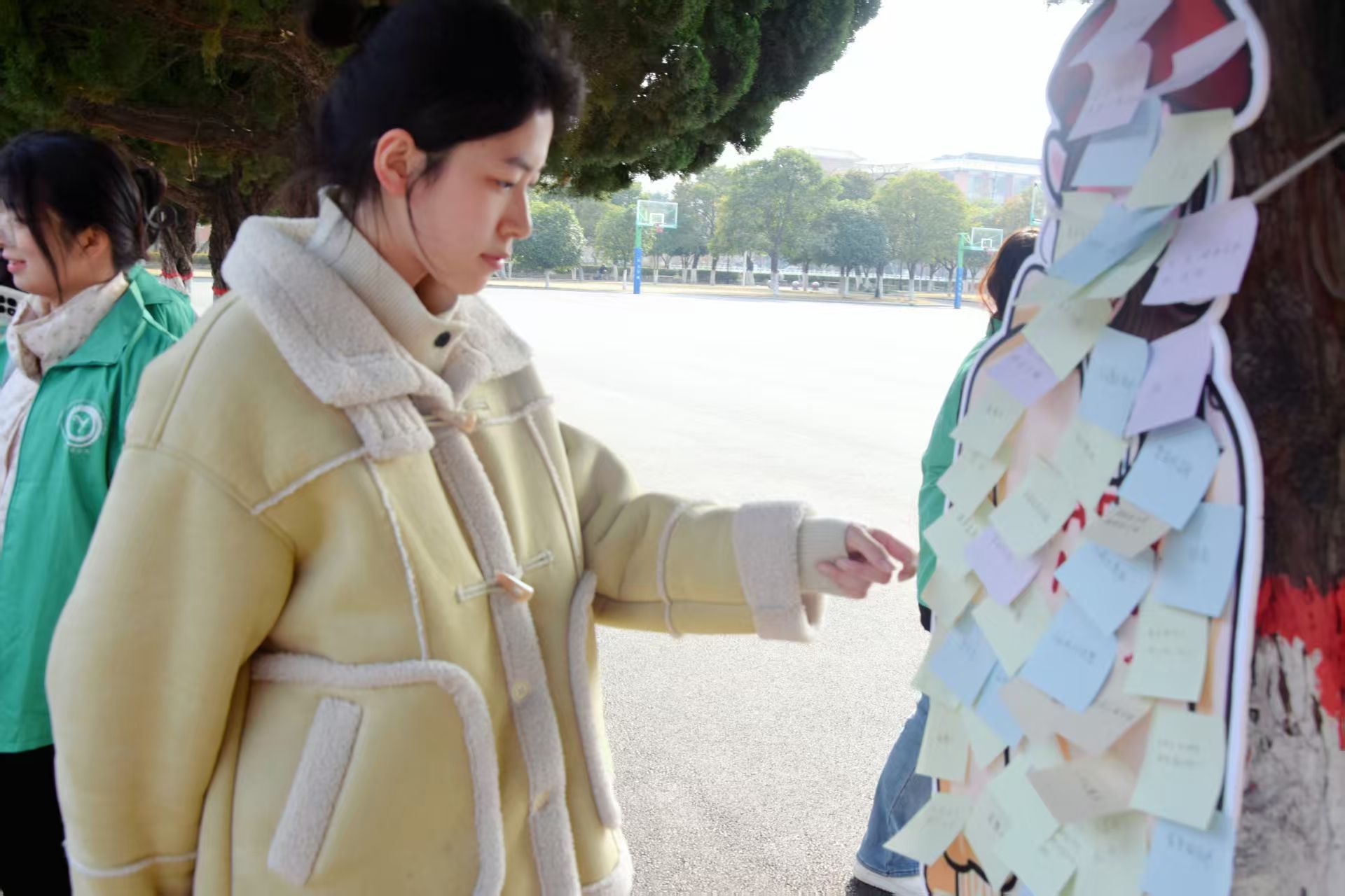 活动现场布置以大树为造型,展板环绕四周,氛围温馨。同学们踊跃参与,将代表不合理认知的标签一一撕下,随后写下“坚韧无畏的探索者”“智慧闪耀的领航员”等对自我全新诠释的寄语。撕下的标签被有序贴在一旁的展示区,与新写下的自我寄语进行对比,显示了同学们对自我更深刻的认识。