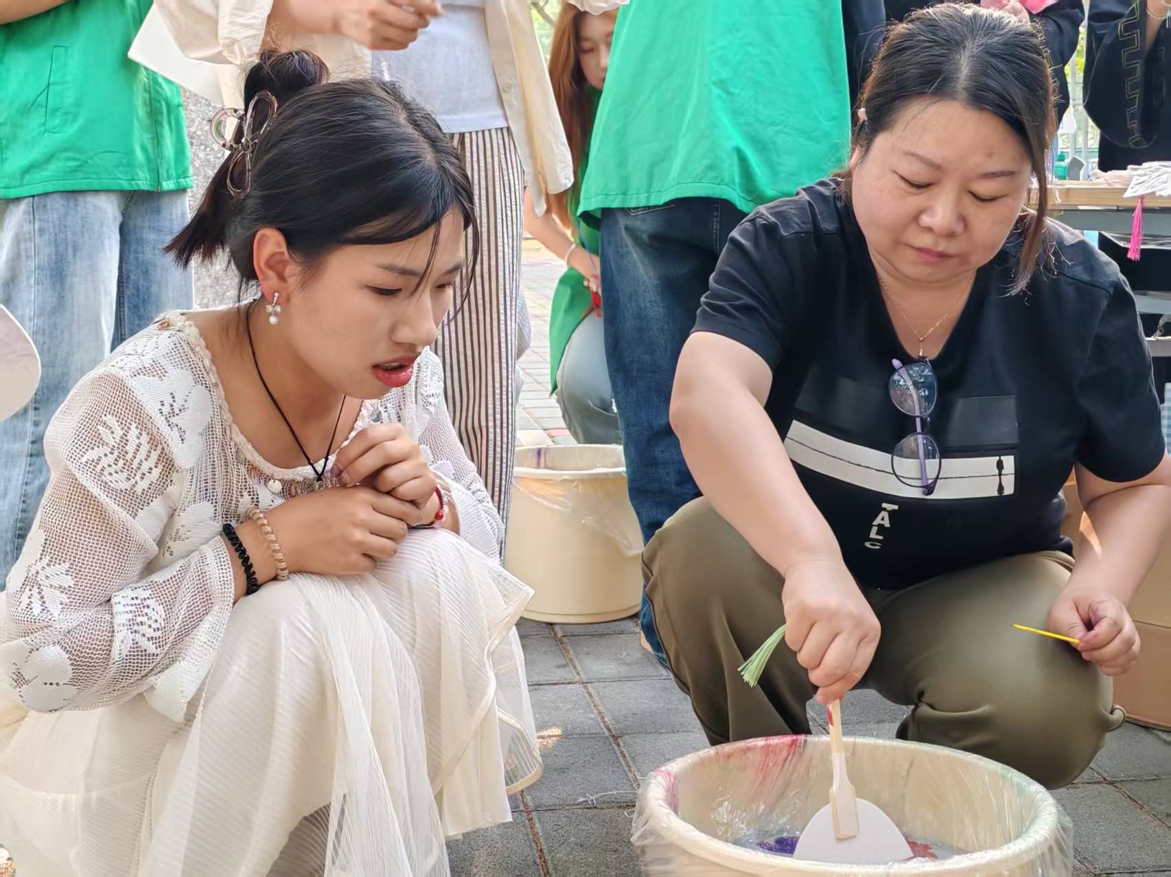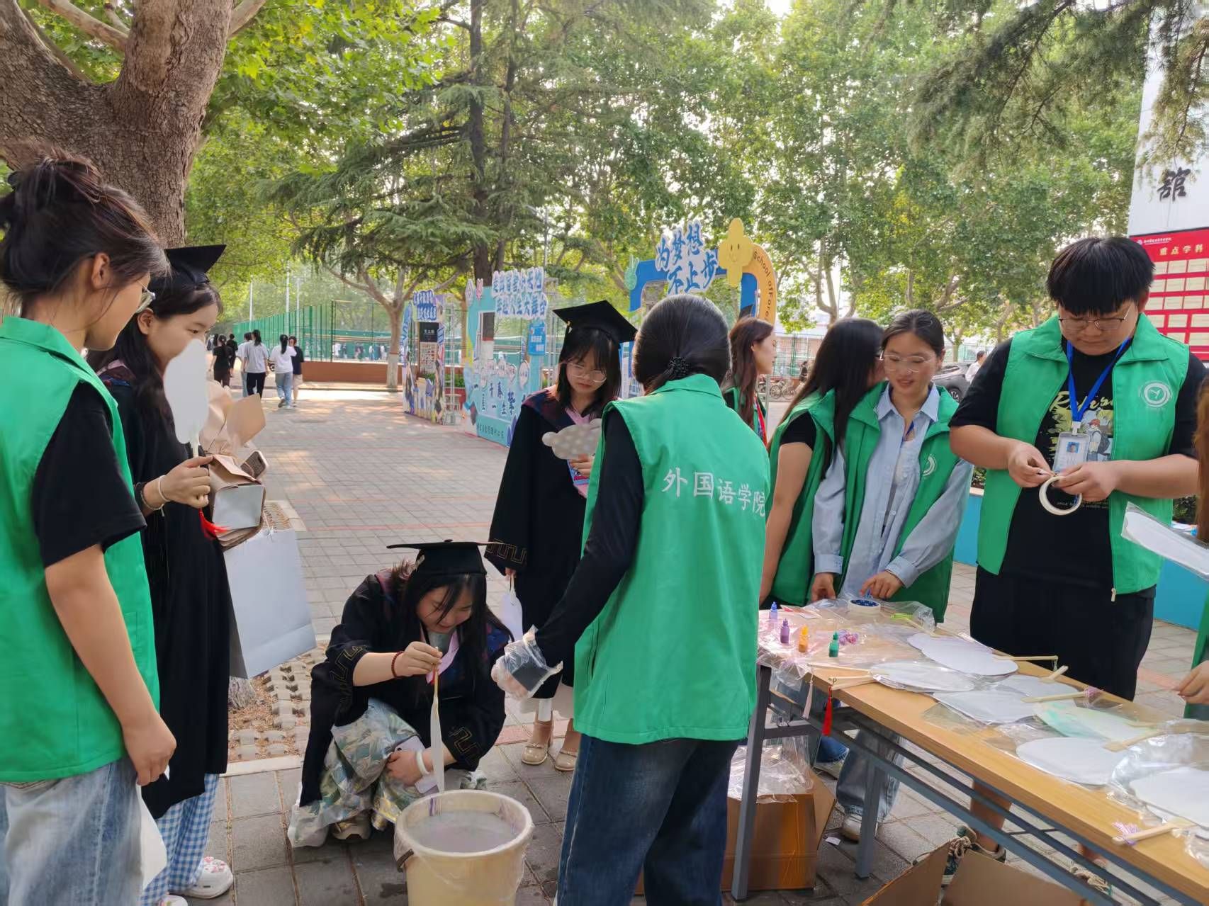 为向即将毕业的外语学子送上别出心裁的祝福,同时传承弘扬中华优秀传统文化,由外国语学院团委主办,外国语学院学生会承办的我为同学办实事系列活动——“非遗无国界:多语种文化工坊之非遗漆扇”活动于2025年5月29日下午4点,在教学一号楼前成功举办。