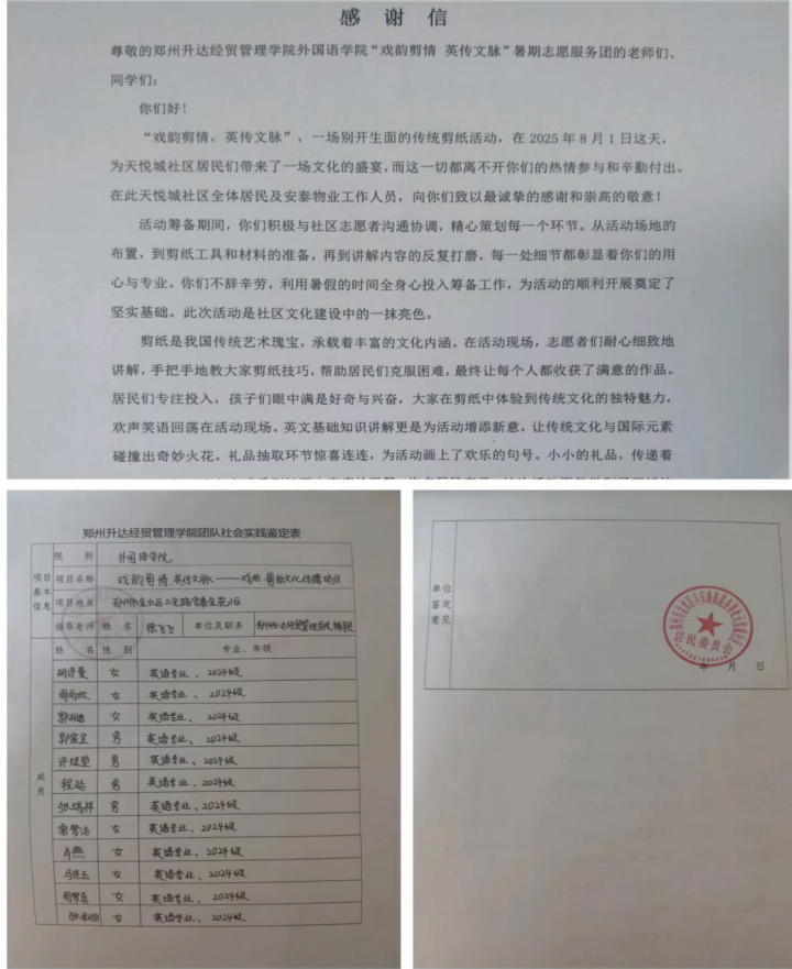 在活动圆满结束后,天悦城社区特意向我们发来感谢信,对外国语学院“戏韵剪情,英传文脉”暑期实践志愿服务团表达了诚挚谢意,称赞活动以新颖形式让剪纸文化走进居民生活,英文知识融入更添交流活力。这封感谢信,是对外国语学院师生们实践努力的温暖肯定,也激励着团队成员继续以文化为桥,连接更多美好。