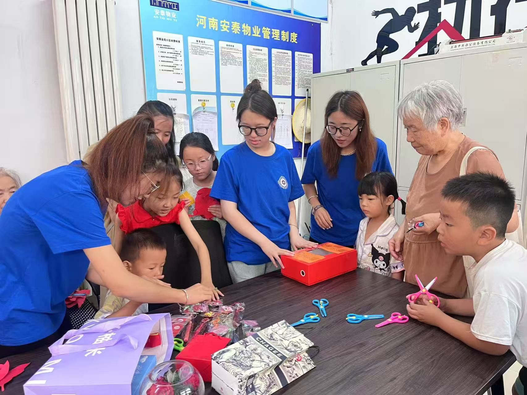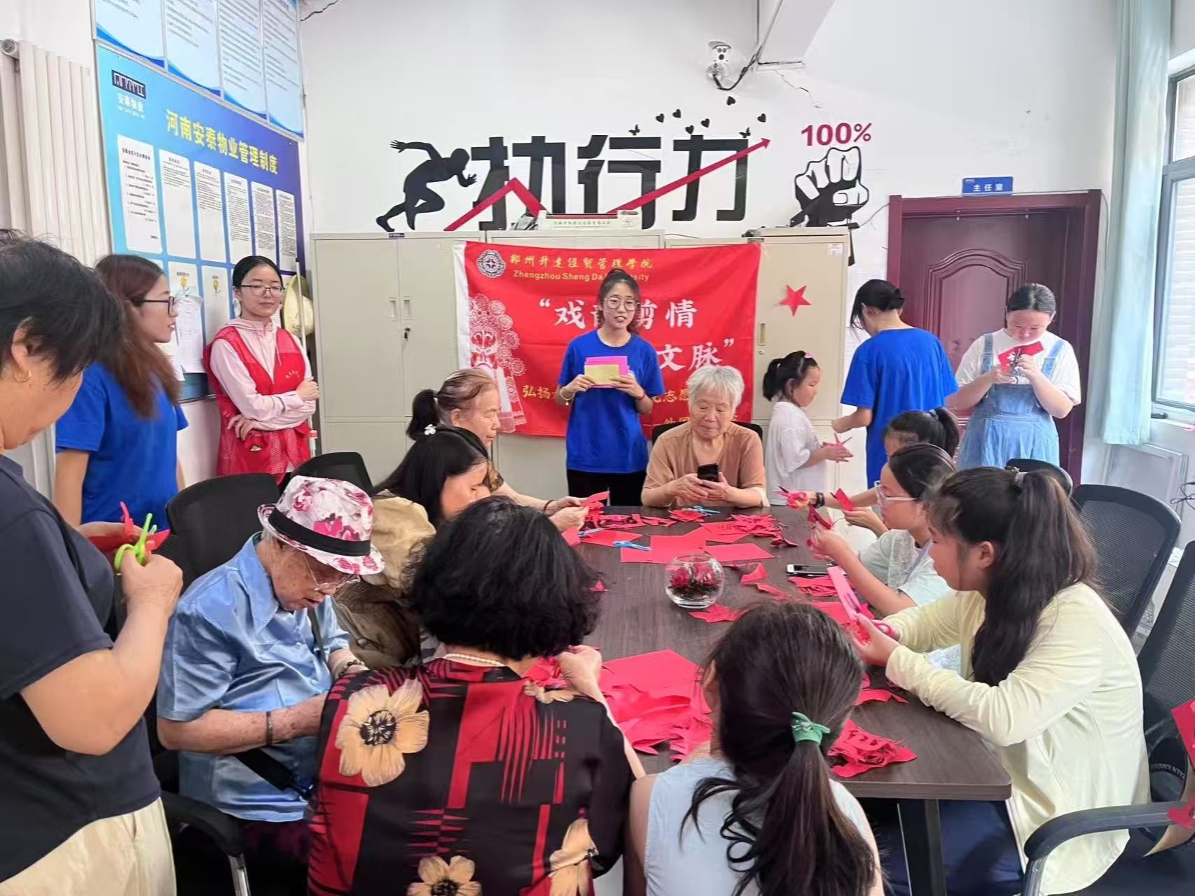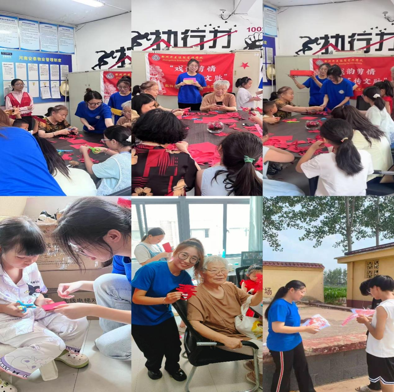 2025年8月1日上午10点,郑州市金水区安泰金苑社区内剪刀翻飞、笑语盈盈,一场以“戏韵剪情,英传文脉”为主题的传统剪纸活动在此温馨开展。本次活动我们外国语学院师生旨在通过“体验+讲解+互动”的形式,让社区居民们感受剪纸文化魅力,助力优秀传统文化鲜活传递,同时融入英文知识,促进跨文化交流。本次我们的剪纸实践志愿服务团由外国语学院辅导员徐飞飞老师和4名学生组成。在本次社区实践活动中,我们充分发挥英语专业特长,成功举办了一场别开生面的传统剪纸艺术体验活动。通过与社区居民的深入交流,我们不仅生动展现了剪纸艺术的独特魅力,更实现了传统文化与现代生活的有机融合。活动既让传统艺术在当代社会焕发新生,也通过文化传播增进了社区温情。此次实践不仅响应了大学生参与社会服务的号召,更以实际行动推动了优秀传统文化的传承与创新,让文化之美绽放在日常生活之中。