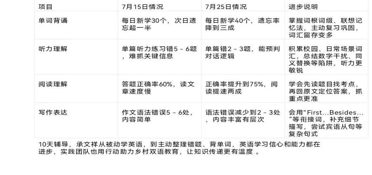 家乡尤其是基层地区,优质英语教育资源往往相对匮乏,不少学生可能缺乏专业的英语指导。团队成员带回更系统的学习方法、标准的发音以及外界的语言学习理念,能弥补当地教学的短板,让家乡学生接触到更优质的英语启蒙或进阶辅导,减少因地域差异导致的英语学习差距。对团队成员而言,辅导过程也是自我提升的过程。在梳理知识、讲解内容的同时,能深化自身对英语的理解,锻炼表达与沟通能力。更重要的是,通过切实帮助到家乡的孩子,能感受到强烈的成就感和归属感,让个人价值在反哺家乡中得到体现。本次实践,就像在不同的土壤里播撒种子,用适配的阳光雨露,让每颗种子都能按自己的节奏,慢慢长成参天大树。