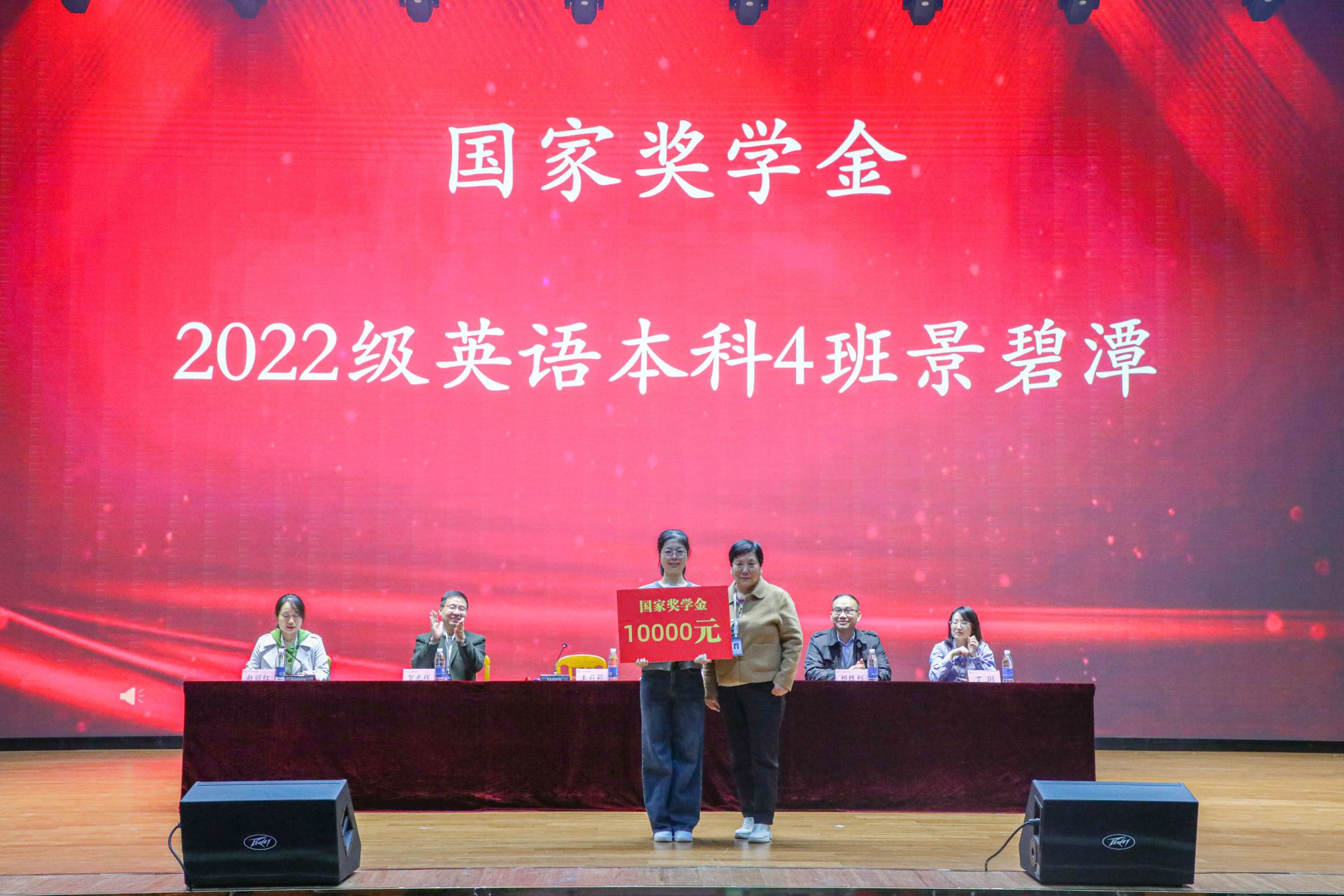 随后,大会进入表彰颁奖环节。现场对在各类专业竞赛中斩获省级及以上奖项的学子、2024-2025 年度聚力奖学金获得者、国家励志奖学金获得者及国家奖学金获得者予以表彰。其中,22 翻译本科 1 班申思羽获第三届 “外文奖” 全国大学生英语翻译大赛全国二等奖;22 级商务英语本科 1 班张淼、23 级英语本科 1 班陈苗苗获 21 世纪杯全国英语演讲比赛省级一等奖,22 级英语本科 1 班魏蓓佳获省级二等奖,23 级英语本科 3 班许宇晴获省级三等奖;2022 级英语本科 4 班景碧潭获国家奖学金。学院领导为获奖学生逐一颁发荣誉证书,现场掌声雷动,气氛热烈。