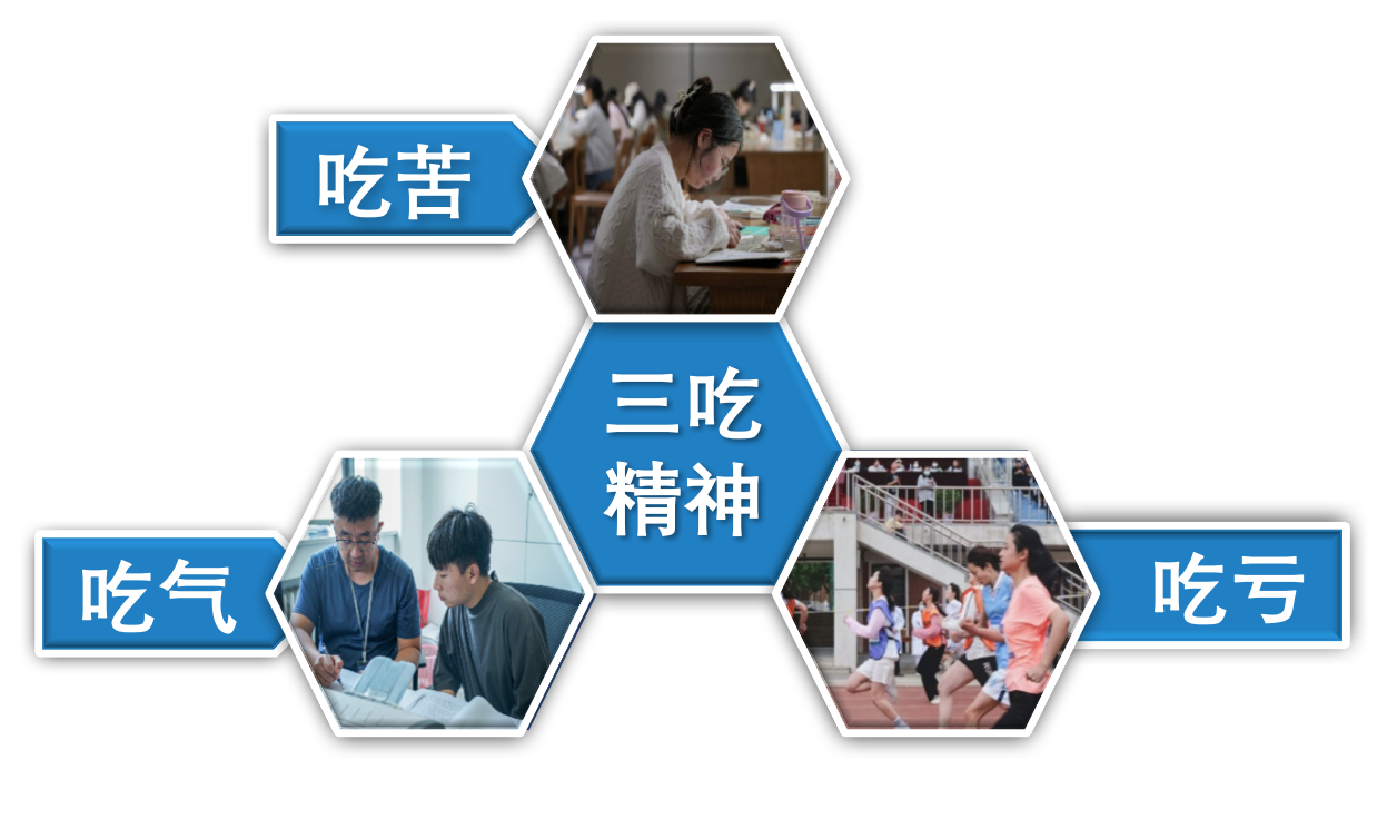 创新人才培养模式,秉持“三吃”精神。“吃苦、吃亏、吃气” 是指要能吃苦,能吃亏,能吃气。吃苦是宝贵的人生经历。孟子曰:“天将降大任于斯人也,必先苦其心志,劳其筋骨,饿其体肤,空乏其身,行拂乱其所为也,所以动心忍性,增益其所不能。” 吃亏是人生修养的一种境界,中国共产党的宗旨是全心全意为人民服务,为人民服务“吃亏是福”。吃气就是培养师生有宽宏大量的胸襟,当遇到困难和挫折时,在面对误解和委屈时,要不失激情和斗志。