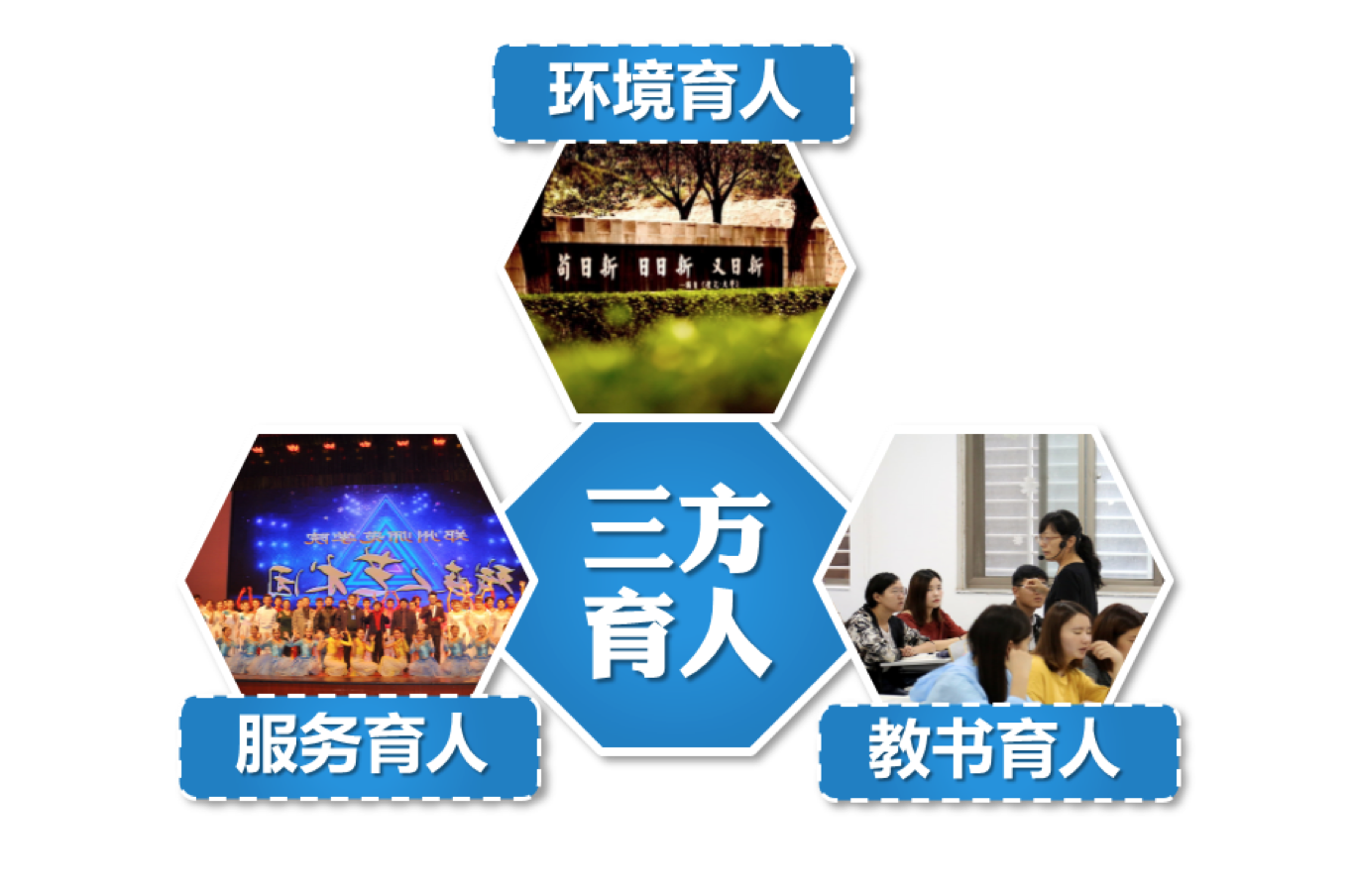 注重全程渗透,不断强化“三方育人”。一是教书育人。挖掘各课程所蕴含的育人元素,将思想政治教育融入教育教学全过程,强调课堂讲授纪律;加强师德师风建设,推进教师思政,以教师严谨治学的精神,带动学生形成端正的求学做人态度。加强学业指导,为学生配备班级学业导师,充分发挥学业导师在人才培养中的作用。二是服务育人。注重心理咨询服务,强化创新创业教育与就业指导服务,建立健全多元化的学生资助体系,构建“全天候、四深入、多渠道”的师生交流沟通机制,以“关心、爱心、耐心”服务学生成长成才。从楼宇设计细节着手,宿舍楼房间宽,学生活动可以转起来,楼层高,上铺学生可以站起来,为学生配备纯净水和空调等设备,不断改善学生在校学习、生活条件。三是环境育人。校园随处可见标语景观和匾额、楹联、格言,师生耳濡目染,在潜移默化中受到中华优秀传统文化和社会主义先进文化的熏陶。