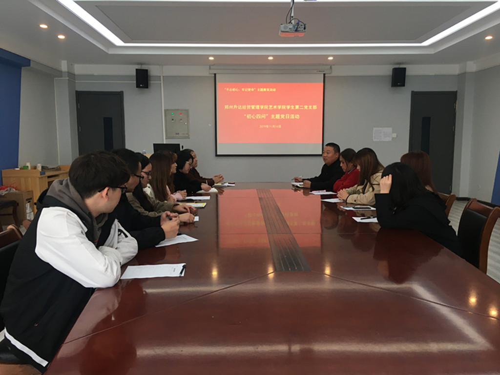11月14日下午,艺术学院学生第二党支部在艺术楼411召开“初心四问”主题党日活动,第二党支部书记高晓阳老师主持会议。