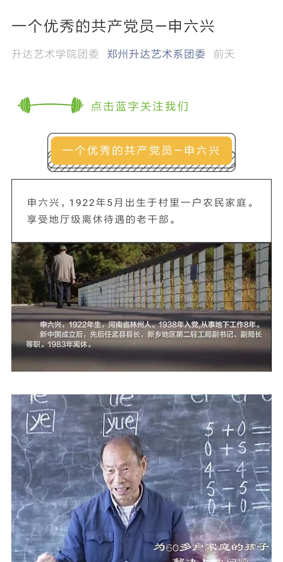 最后,艺术学院通过学院微信官方公众号发布“一个优秀的共产党员——申六兴”文章,向广大师生宣传申六兴光辉事迹,扩大学习效果。