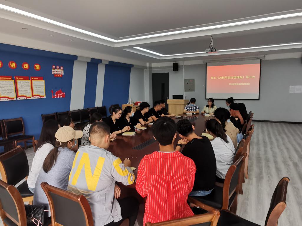 2020年9月26日下午三时,艺术学院学生第三党支部组织召开学习<习近平谈治国理政>第三卷学习活动,会议由支部书记袁敬老师主持,组织委员孙凤娟老师、宣传委员王丽丽老师和学生第三党支部全体学生党员参加了此次会议。