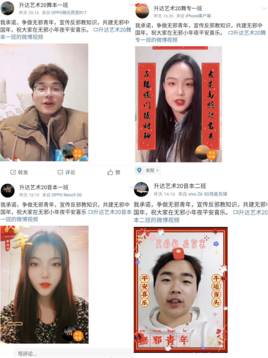 因疫情期间遵守非必要不外出不聚集的原则,活动仍以网络为主,线下活动为辅,除了分享转发相关反邪文案之外,音乐表演专业的同学们还制作反邪教宣传视频口号,号召大家弘扬正能量,共度“无邪中国年”,以新颖的方式让宣传效果变得更好。