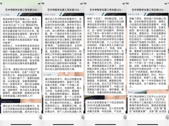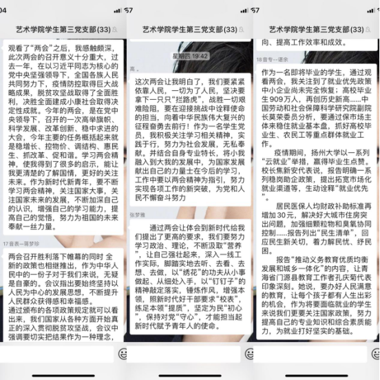 自两会召开以来,艺术学院学生第三党支部积极组织学习活动,活动包括线上听取报告,聚焦两会热点,线下查阅相关文献,深入学习两会精神。