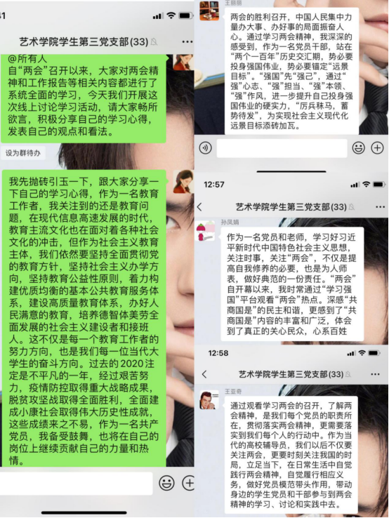 3月10日和3月11日,全国政协十三届四次会议和第十三届全国人大四次会议相继闭幕。3月11日晚上19时,艺术学院学生第三党支部全体师生党员在支部微信群开展两会精神主题线上分享交流会。本次会议由支部书记袁敬同志主持,支部全体师生党员参与讨论。