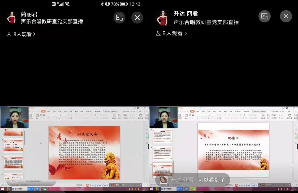 4月7日,艺术学院声乐合唱教研室党支部全体教师党员在线上开展“全民国家安全教育日”专题学习会,会议由支部书记蔺丽君主持并进行讲解。