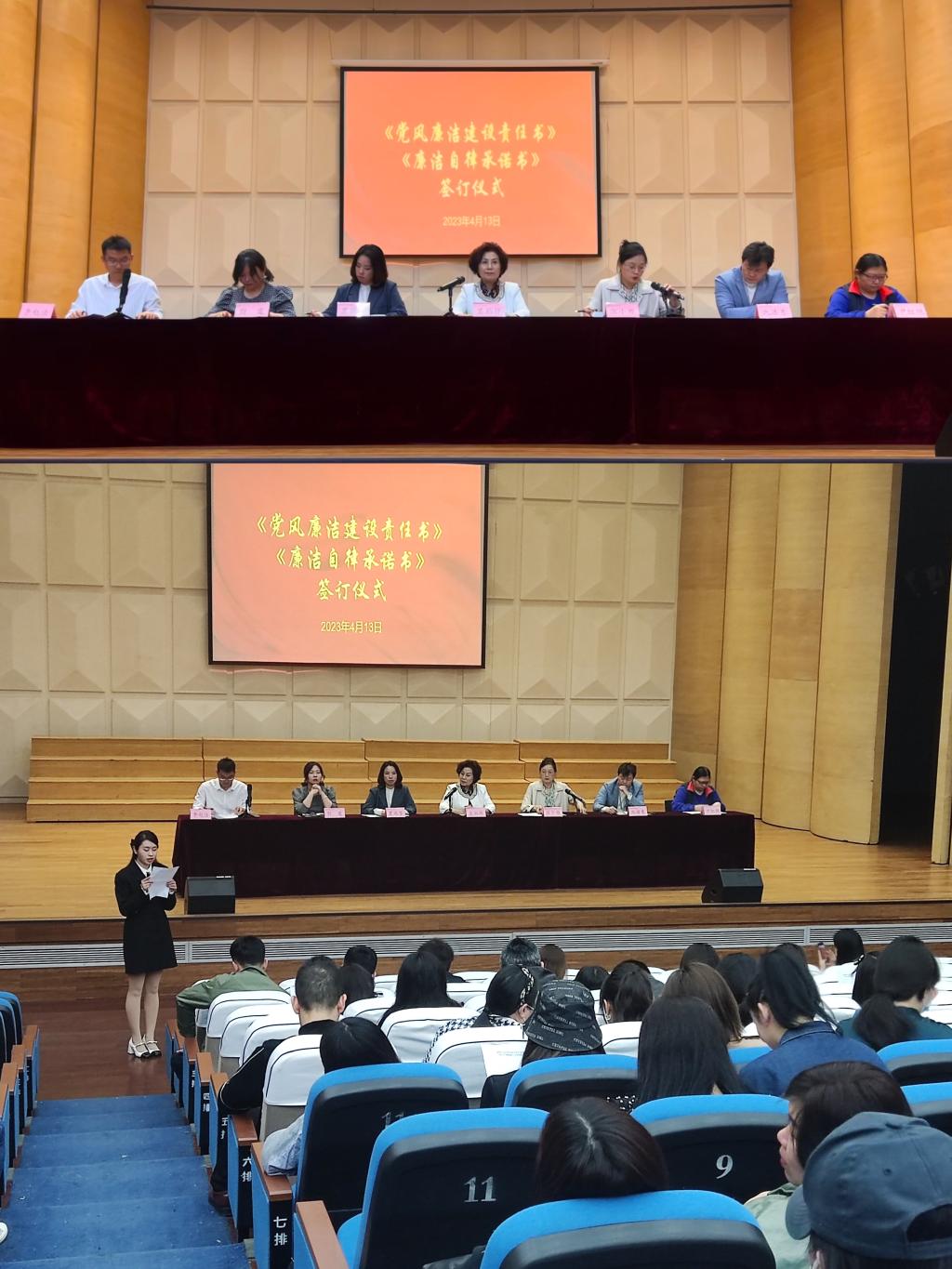 学院党委书记张小雁首先传达了校党委2023年党建暨全面从严治党工作会议的精神。张书记强调,2023年是贯彻落实党的二十大精神的开局之年,是后疫情时代的第一年,也是我校校庆三十周年。希望大家都能聚焦个人主责、扎实开展所管辖范围内人员关于理想信念、廉洁自律、能力素质各项教育。围绕全面从严治党新要求,严格落实党组主体责任,强化党建引领,深化理论学习;强化党风廉政建设,从严从实开展以案促改,创建清廉校园。接着,行政人员代表、专职教师代表、辅导员代表宣读了《廉洁自律承诺书》。随后,学院领导班子成员签订《2022年度党风廉洁建设责任书》,并公开承诺:在工作中坚持公私分明,坚持崇廉拒腐败,坚持尚简戒奢,崇尚吃苦在前,党员干部承诺要注重廉洁从政、用权、修身、齐家,自觉树立良好风范,提升思想道德修养。学院全体教职工签署《廉洁自律承诺书》,并公开承诺:杜绝一切有损教职工职业队伍形象的行为,坚持身正为范,服务育人,要以“四有”好教师为标准,将师德师风建设落到日常的工作中,从自身做起,做师德表率。