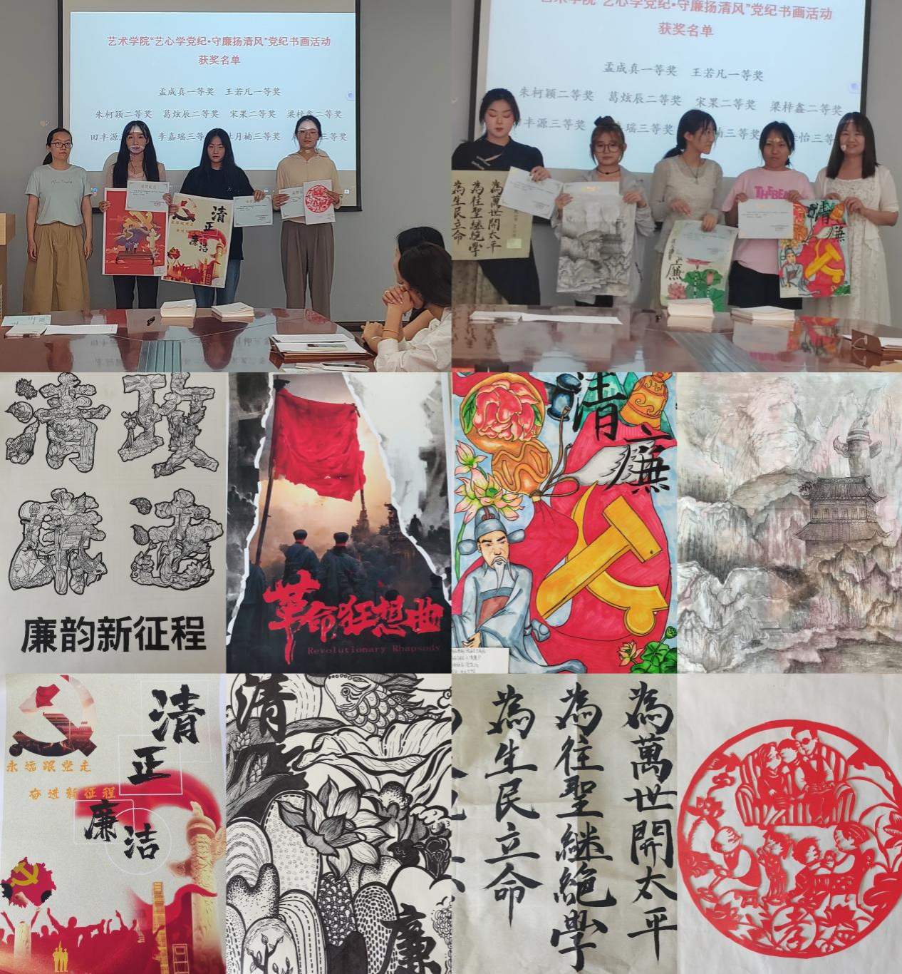 本次活动自5月初进行宣传、征集,作品内容围绕学校党风廉政建设,聚焦学习《中国共产党纪律处分条例》,以“艺心学党纪·守廉扬清风”党纪学习教育为主题,重点从弘扬廉政勤政、优良家风、孝老爱亲、勤俭节约、向善向上等方面进行创作,主要展示书法、国画、油画、水彩画等书画类作品。经过评选,10个优秀作品脱颖而出,现场对优秀作品进行展示,对获奖学生颁发荣誉证书。其中学生孟成真、王若凡荣获一等奖;学生朱柯颖、葛炫辰、宋果、梁梓鑫荣获二等奖;学生田丰源、李嘉瑶、杜月楠、周佳怡荣获三等奖。