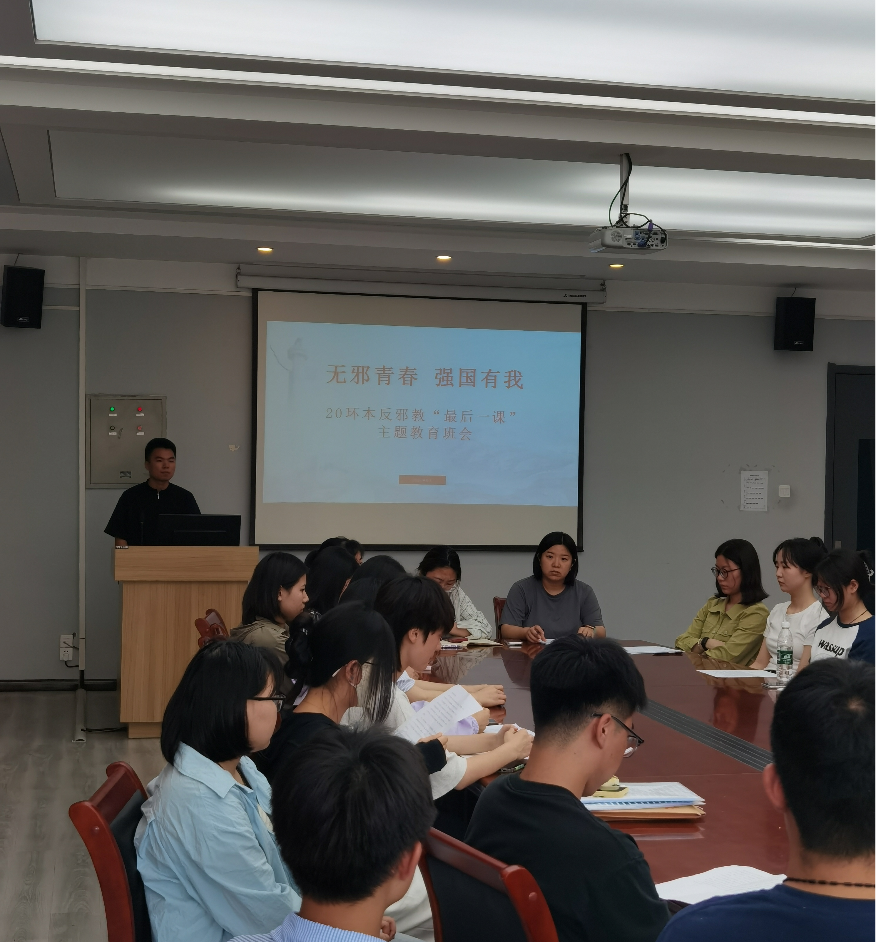 此次活动以“无邪青春 强国有我”为主题,会议开始,辅导员老师向同学们宣讲什么是邪教,邪教的本质等内容,教育引导学生认清邪教的危害,增强识邪,防邪的意识和能力,增强国家安全观念。其次,辅导员老师们从邪教的危害和如何抵制邪教的侵害两个方面进行了细致的阐述,并通过以案说法,列举了国内外邪教组织造成的社会性案件,揭露了邪教破坏家庭,危害社会,残害生命等本质,提醒毕业生们要树立法制观念,注意识别和防范,预防邪教组织的侵害。最后,辅导员老师向同学们发出倡议,同学们要深刻认识到邪教组织的欺骗性和危害性,增强防范邪教组织的意识。要积极崇尚科学,不信奉迷信,自觉抵制各类邪教组织的引诱,与各类邪教组织作坚决斗争。