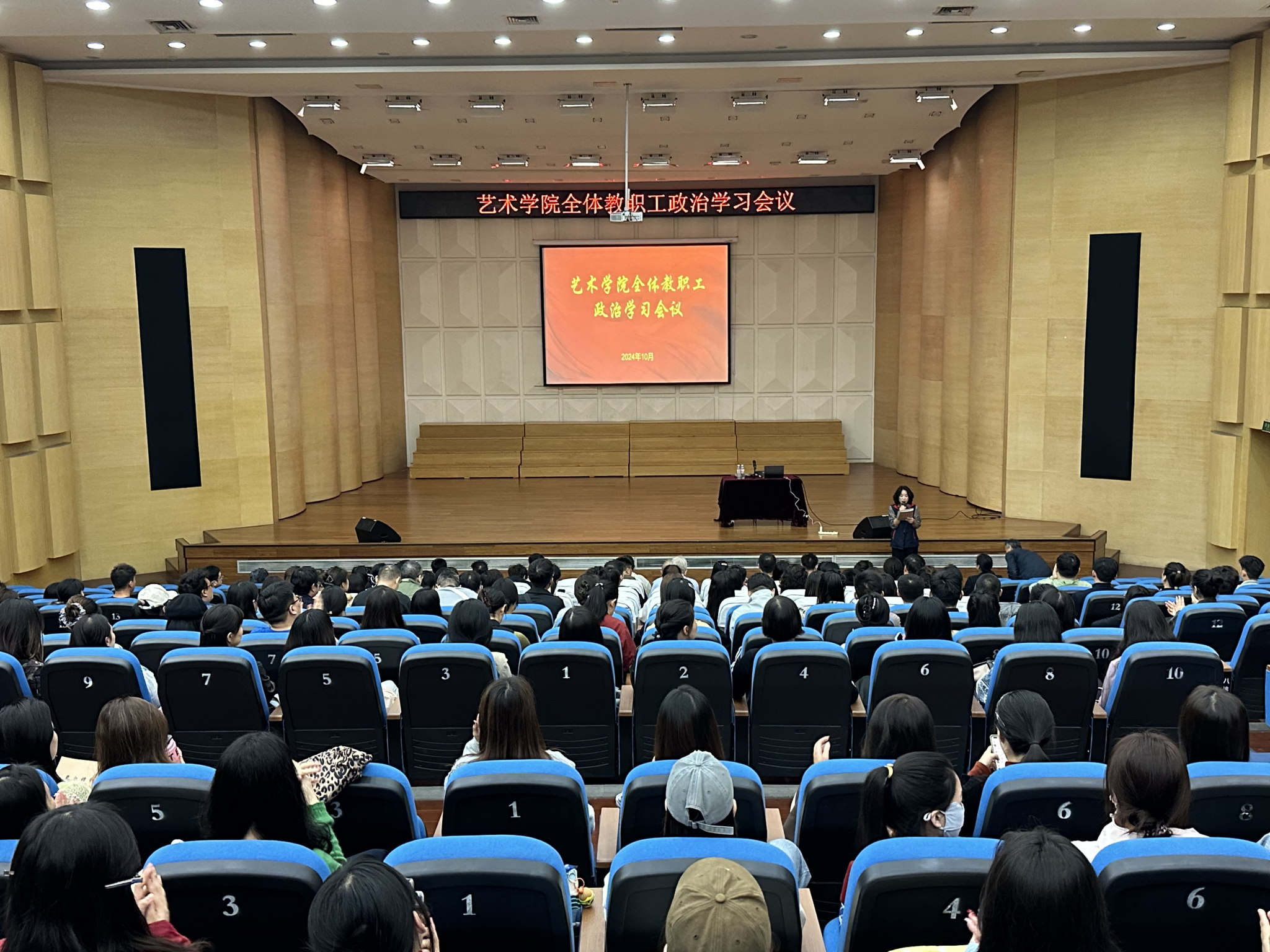 为贯彻习近平总书记重要讲话和全国教育大会精神安排部署,切实增强全体教职工贯彻落实习近平总书记重要讲话和全国教育大会精神的政治自觉、思想自觉和行动自觉。10月17日下午,艺术学院在音乐厅召开全体教职工政治学习会议,本次会议由艺术学院副院长夏瑞芳主持,艺术学院全体教职工共同出席会议。