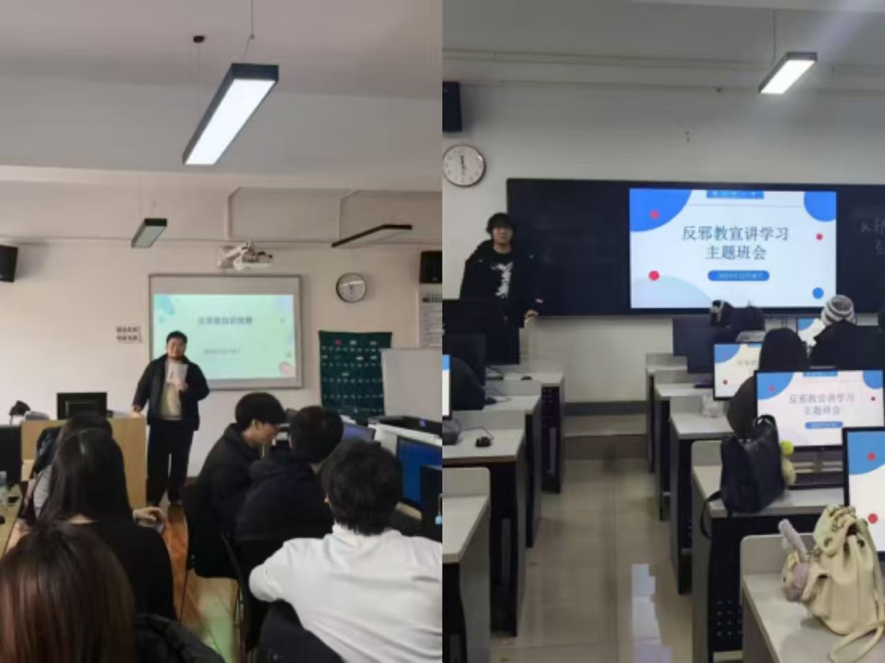 与此同时,各班级积极组织开展主题班会。班会上,通过系统讲解反邪教知识,结合案例分析揭示邪教的危害本质;设置知识答题环节,围绕宪法法律法规及反邪教常识开展互动问答;组织观看反邪教警示教育片,以真实案例警示学生认清邪教危害。班会内容丰富、形式多样,有效提升了学生的法律素养和安全防范意识。