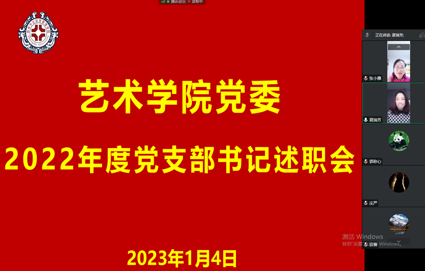2023年1月4日下午14:30,艺术学院党委通过腾讯会议召开2022年度党支部书记述职会。本次会议由院党委副书记夏瑞芳同志主持,艺术学院党委书记张小雁、党委委员及全体支部书记参加本次大会。