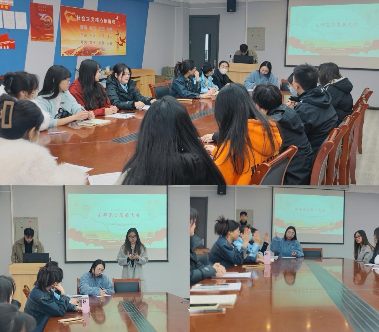 首先,大会讨论了张诚信、高家宝、王楠、唐心怡等7位发展对象能否入党问题。张诚信、高家宝、王楠、唐心怡、宋沛涵、屠明琪、柯海芬7位发展对象分别宣读了入党志愿书,汇报了对党的认识、入党动机、本人主要社会关系等情况。随后,7位发展对象的入党介绍人介绍了其在校的表现,并对其能否入党发表了各自意见。除介绍人外,与会其他党员也充分发表了意见,对发展对象逐个展开讨论。最后通过现场匿名投票的形式逐个表决投票。表决一致通过接收张诚信、高家宝、王楠、唐心怡、宋沛涵、屠明琪、柯海芬7位同志入党。