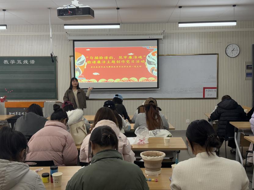 为创新廉洁教育形式,将传统文化与党性教育相结合,12月12日,音乐表演与舞蹈表演专业学生第一党支部在艺术楼301教室成功举办“勾描脸谱韵,筑牢廉洁魂”脸谱廉洁主题创作活动。党支部书记吕文娟同志、党支部组织委员杨孟珂同志和党支部宣传委员李慧同志出席活动,党支部全体成员和入党积极分子参与,活动由党支部书记吕文娟同志主持。