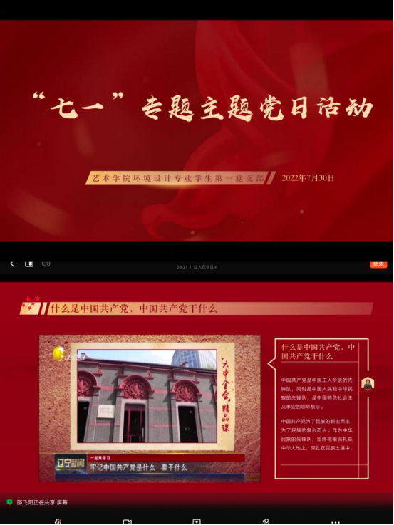 为庆祝中国共产党成立101周年,深入学习贯彻习近平新时代中国特色社会主义思想和党的十九届六中全会精神,巩固拓展党史学习教育成果,学习先锋榜样,充分发挥基层党组织战斗堡垒作用和广大党员师生的先锋模范作用,以实际行动和优异成绩迎接党的二十大胜利召开。2022年7月30日11点,艺术学院环境设计专业学生第一党支部通过钉钉会议形式召开了“七一”专题主题党日活动,本次主题为“庆七一 学榜样 忆初心 喜迎二十大”。会议由支部书记魏双双主持,环境设计专业学生第一党支部全体党员参与了此次主题党日活动。