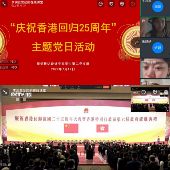 2022年7月17日下午,视觉传达设计专业学生第二党支部通过钉钉视频会议的形式开展“庆祝香港回归25周年”主题党日活动,深入学习习近平总书记在庆祝香港回归祖国二十五周年大会暨香港特别行政区第六届政府就职典礼上的重要讲话精神。会议由党支部书记李润蕊主持,支部全体党员参加。