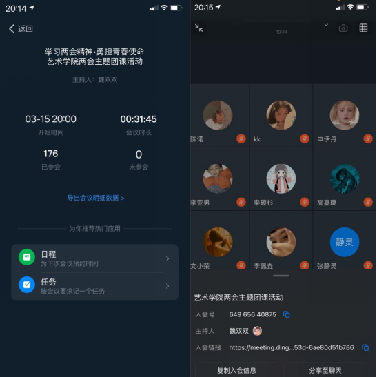 为进一步引导广大青年团员全面深入学习四史、领会两会精神,把个人价值实现融入全面建设社会主义现代化国家新征程和大局之中,充分发挥好生力军和突击队的作用。艺术学院团委余2021年3月15日在钉钉会议室举行了以“学习两会精神·勇担青春使命”为主题的学习两会精神团课活动。本次活动由艺术学院2020级团总支书记魏双双老师进行主要宣讲,2020级各班团支书、优秀团员及第十五届团委学生会干部参加本次活动。