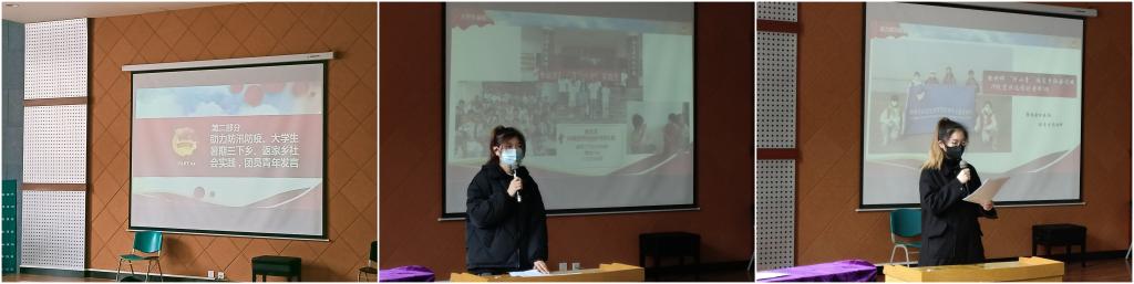 会议第二项,助力防汛防疫、大学生暑期三下乡、返家乡社会实践,团员青年发言。刘安然同学上台讲述黄腾用镜头记录嘉应观防疫的故事,希望青年学生能够把这种投身社会实践的优秀作风延续下去,能够把青马工程的精神践行的更好;19级视传一班的刘文文同学分享自己支教经历,希望能够带动同学们积极参加公益活动,发扬艰苦奋斗的精神,传承优秀美德。能世婵同学分享参加黄河流域保护生态实践活动的经历,激励当代青年、大学生,应牢记我们的职责与使命,积极投身黄河流域保护项目中,为黄河生态文明可持续发展贡献青春力量。