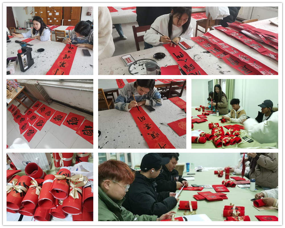 活动中,学生们挥毫泼墨,将寓意美好的句子写在喜庆的春联上。志工部的志愿者们将春联和福字仔细用缎带捆扎好,送给艺术楼外来往的老师和同学们。当天共送出100多副对联和福字。