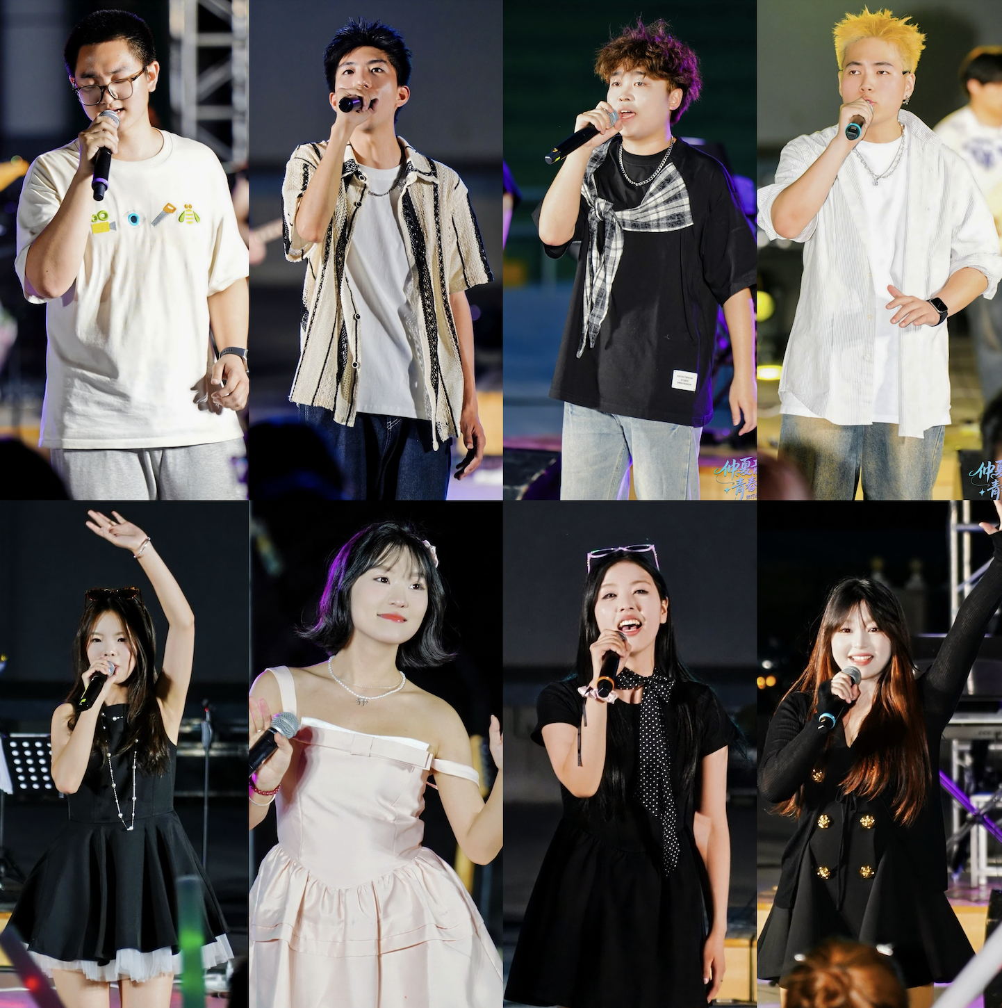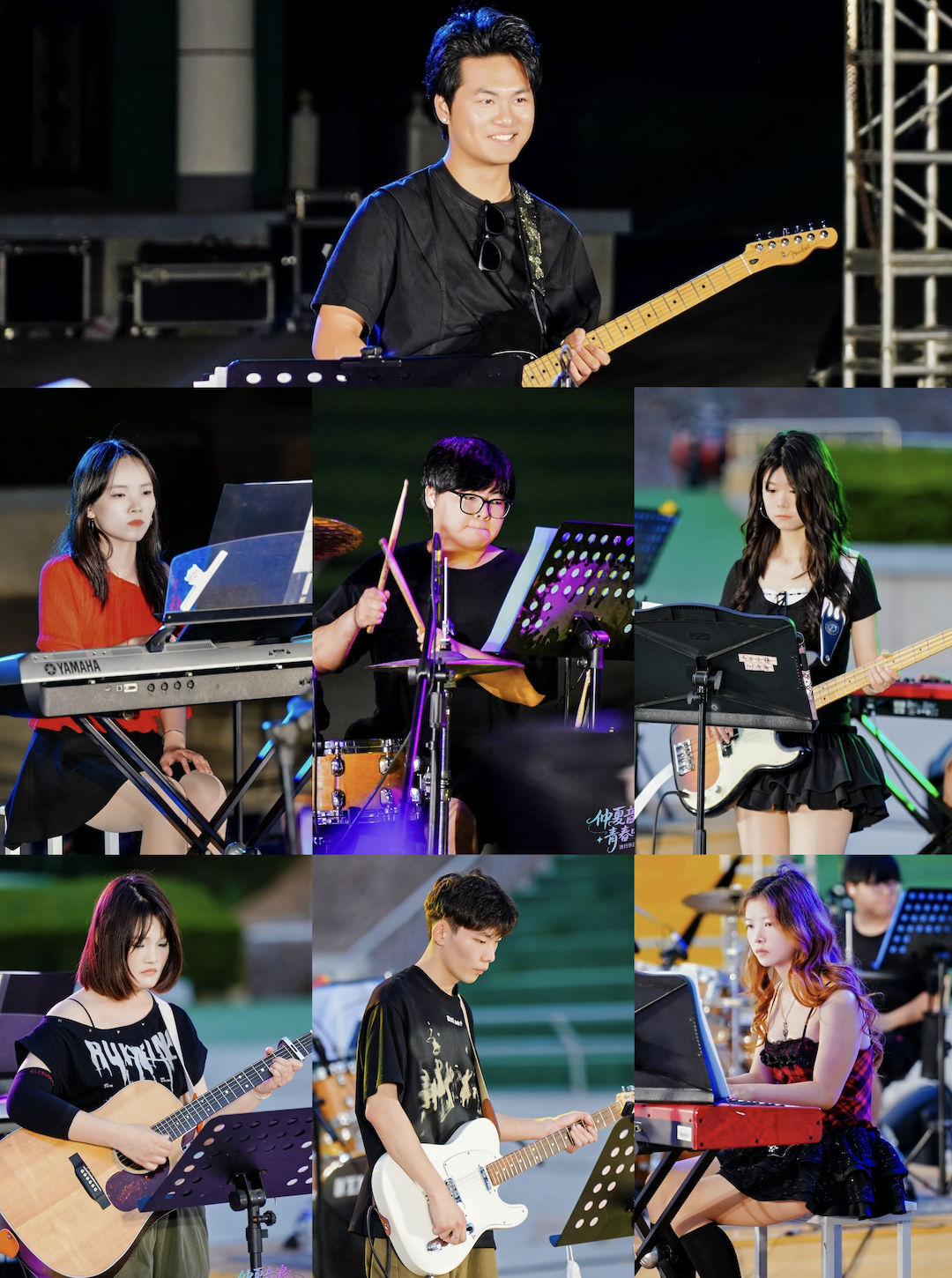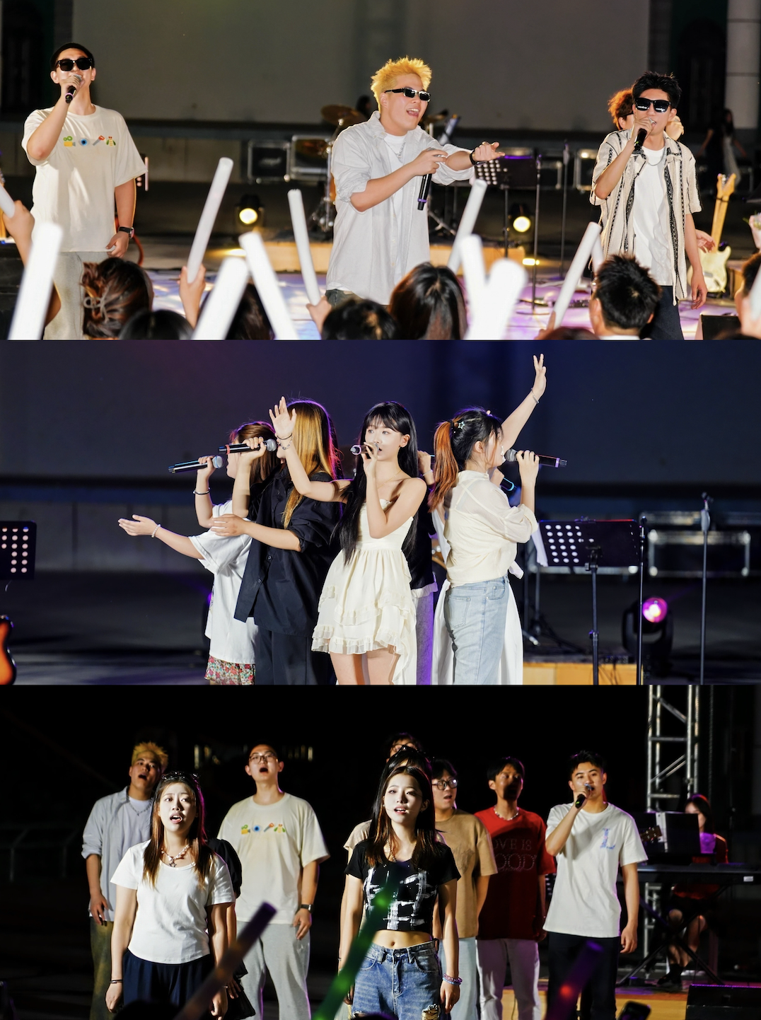 第三部分由2022级乐队和人声组成员,继续为我们带来了激情的四首流行歌曲,分别为《天下有情人》、《热烈的少年》、《蚂蚁蚂蚁》、《直到世界尽头》。其间,艺术学院副院长池浩东对本场活动给予了肯定,并与艺术学院安冉老师为现场观众带来了歌曲《山笑水笑人欢笑》。最后,在结束曲《启程》的温暖旋律中,出席本场活动的领导与全体参演人员共同合影留念。