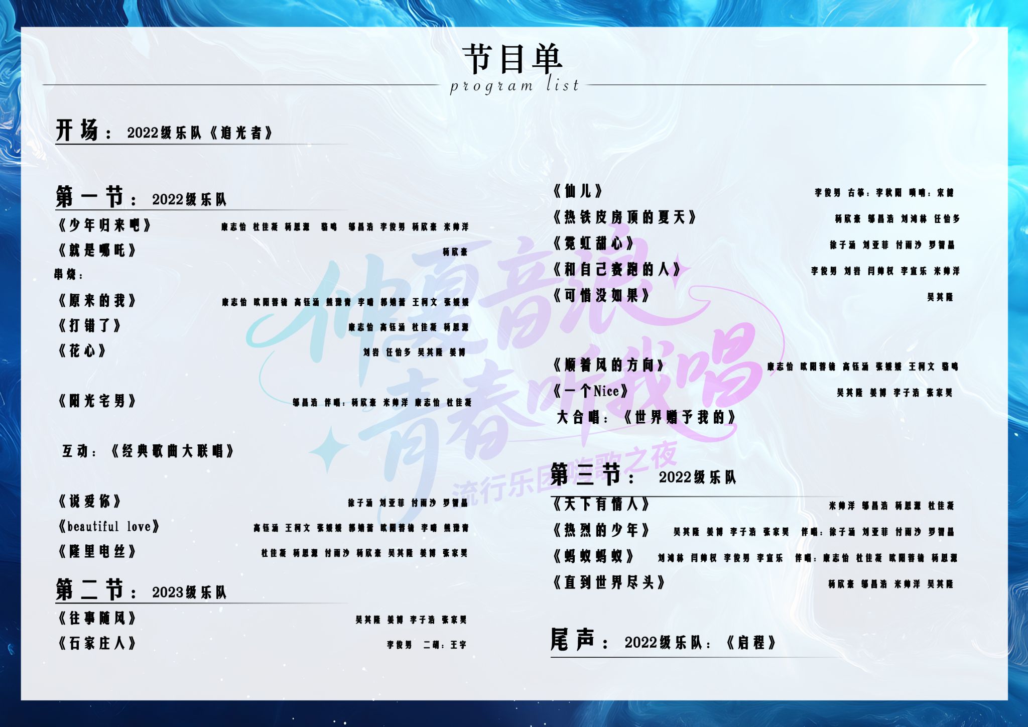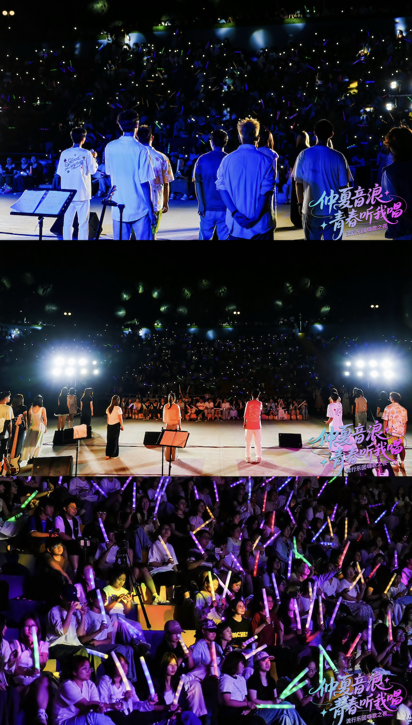 本场演出共分为三个部分,首先是由2022级乐队与101流行乐团的人声组同学共同为大家带来开场表演《追光者》,第一部分的歌曲《少年归来吧》、《就是哪吒》、《歌曲串烧》、《阳光宅男》,以及《经典歌曲大联唱》环节,首次引起了全场观众大合唱。2022级乐队是101流行音乐实训室自成立以来的第六支乐队。