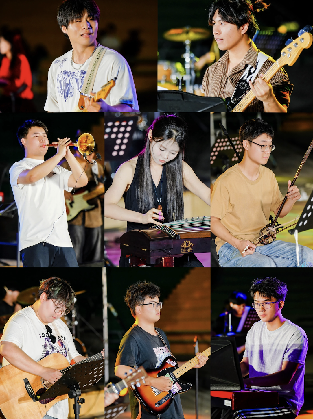 第二部分是由2023级乐队与人声组同学共同带来7首不同音乐风格的作品。其中,在《石家庄人》、《仙儿》这两首摇滚歌曲中,融入了民乐唢呐、二胡和古筝,民乐与流行音乐的融合表演为现场观众带来了不一样的视听体验。