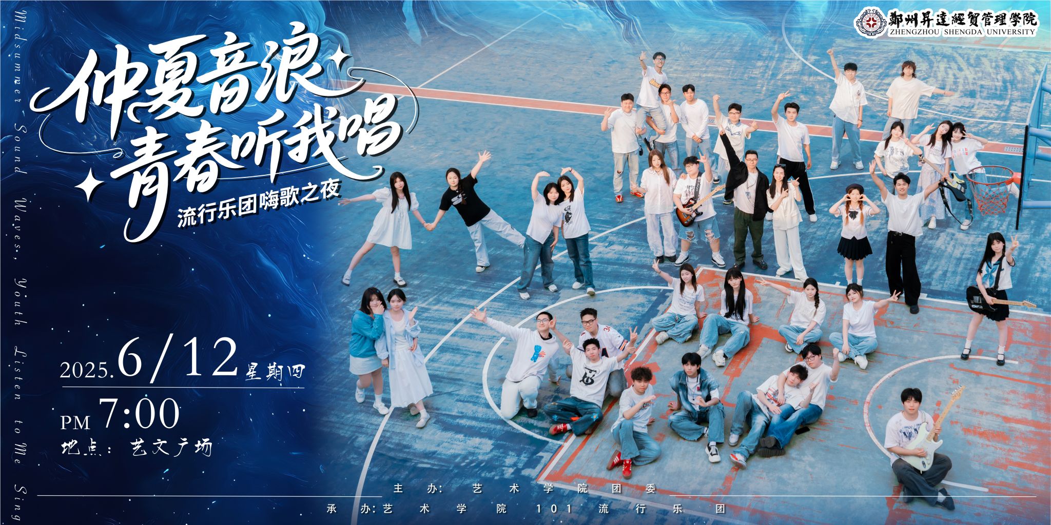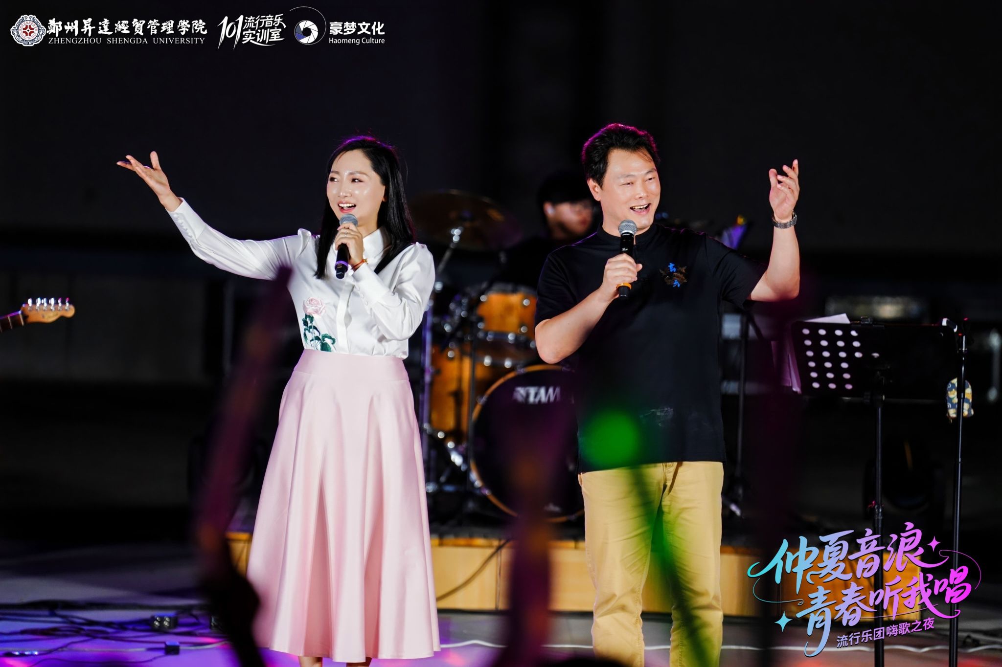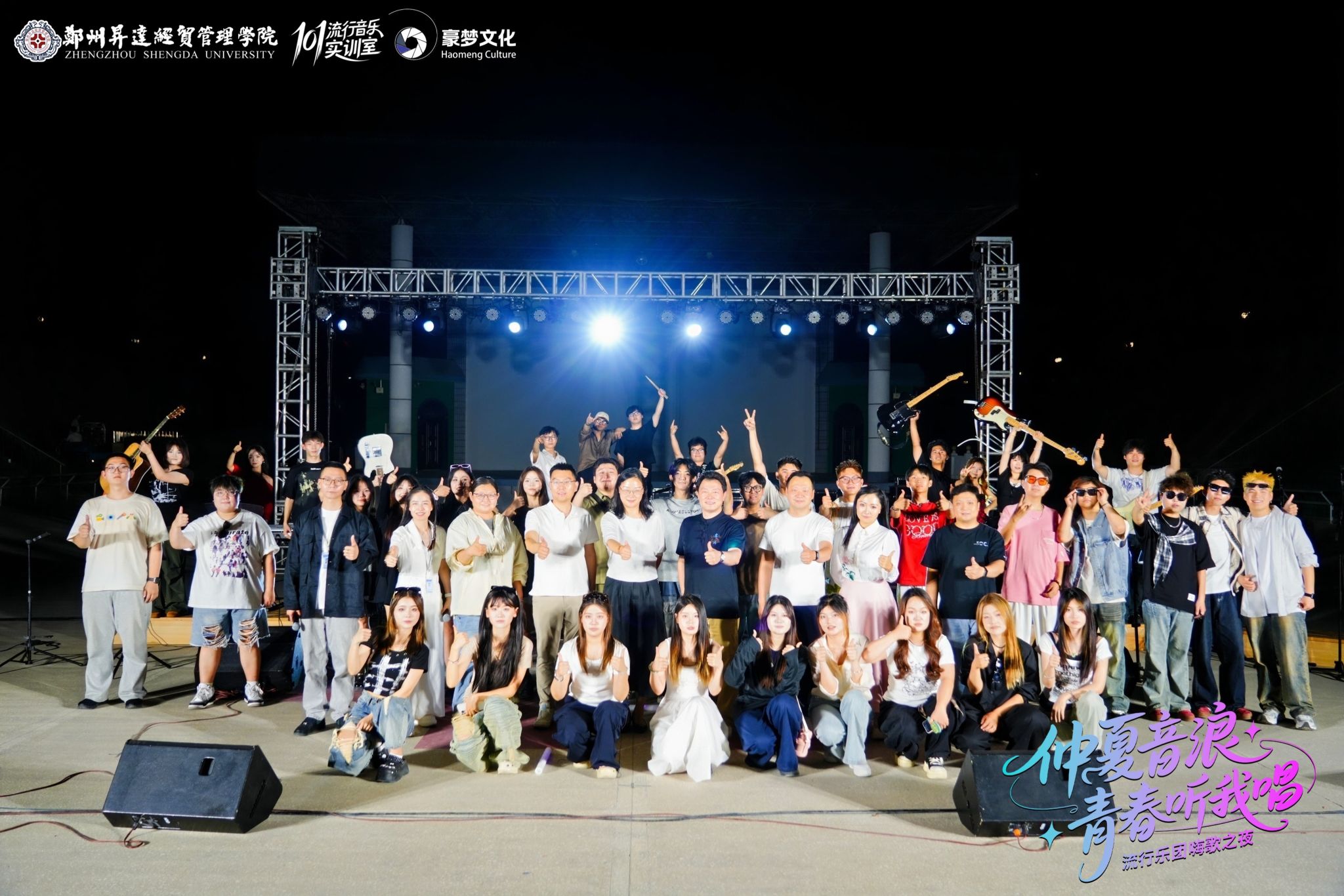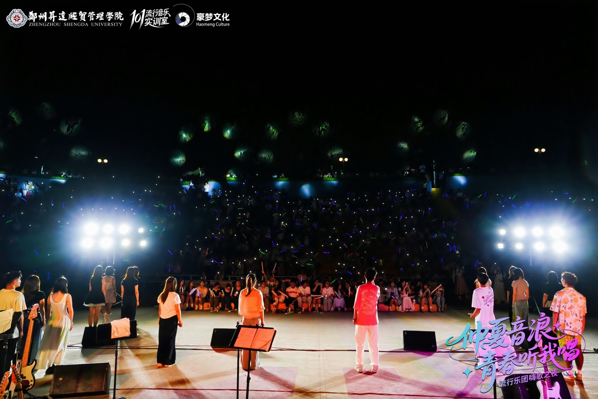 艺术学院101流行音乐实训室自成立以来,一年一度的汇报演出已经成为校园文艺活动的名片。今年更是迎来了新的挑战——第一次从室内来到了室外的表演形式,101流行乐团的指导老师郭亚琼老师和王凡老师,从音乐风格、作品选择、还有节目表演形式都进行了精心的策划和排练。现场面对面建群、荧光合唱等创意互动打造了一个沉浸式的音乐美育实践场景,展示了升达风采。本场超燃的电声乐队Live演出,也得到了与会领导的充分认可。