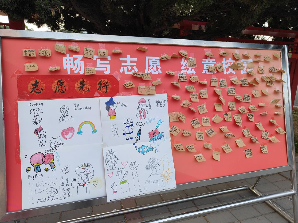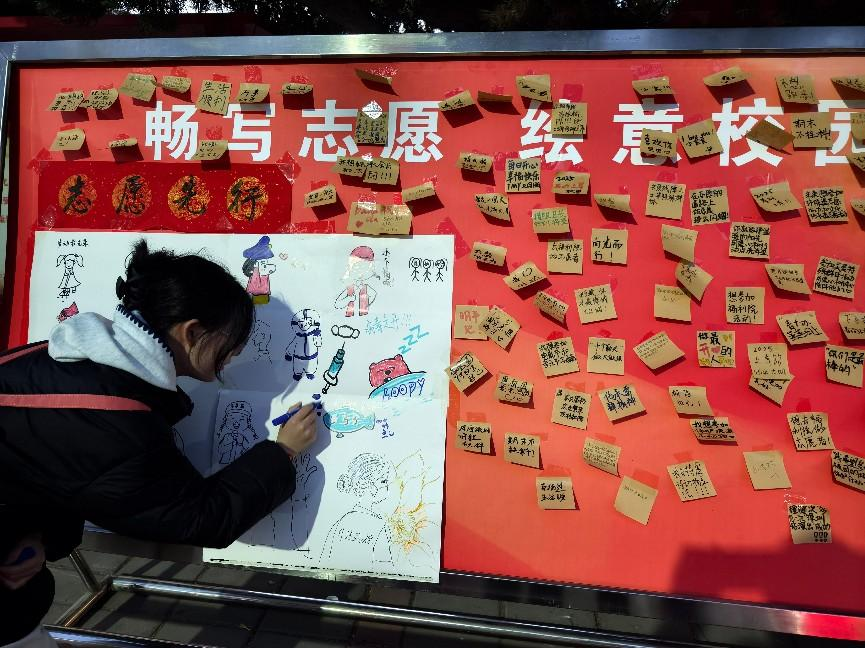 活动伊始,协会工作人员身穿红色志愿者服在明德广场处集合签到。活动所用的展板被划分为绘画区和便利贴张贴区,工作人员进行活动介绍后由参与同学自行选择参与方式。有的同学用画笔勾勒描绘出心中的志愿者形象,有的同学挥毫笔墨,用文字留下心中所感。同时,协会工作人员随机采访现场同学对于志愿精神和志愿服务活动的看法,收集到许多建设性意见。