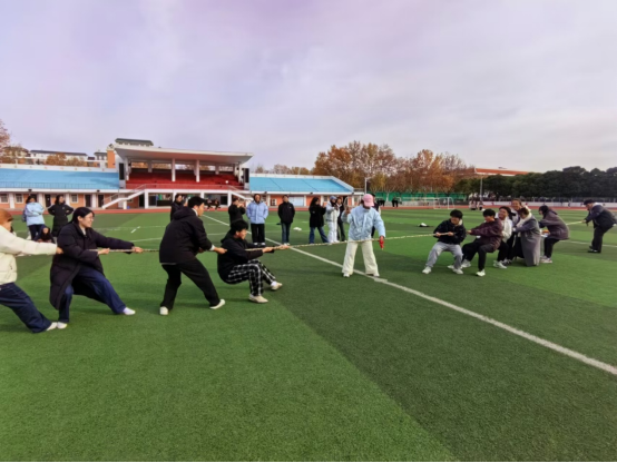 拔河比赛作为开场项目,率先将运动会的气氛推向高潮。参赛队员们双手紧握绳索,身体后倾,双脚蹬地,每一个动作都凝聚着力量与决心。比赛过程中,双方队伍势均力敌,红绳在中线附近来回徘徊,现场同伴们的加油助威声如雷贯耳,为队员们注入了源源不断的动力。
