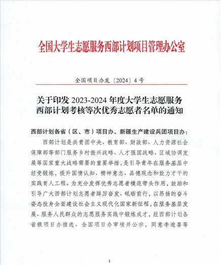 近日,全国大学生志愿服务西部计划项目管理办公室印发《关于印发2023-2024年度大学生志愿服务西部计划考核等次优秀志愿者名单的通知》(全国项目办发〔2024〕4号),根据通知精神,我校5名毕业生获评“全国大学生志愿服务西部计划考核等次优秀志愿者”。