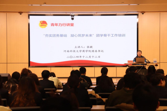 为进一步提升我校团学骨干的工作能力和综合素质,12月12日下午,“青年力行讲堂”特邀河南科技大学商学院团委书记张毅作“夯实团务基础,凝心筑梦未来”专题报告。校团委书记李霄锋出席报告会,校团委机关干部,各学院团委书记、副书记,校第七期青马工程“力行班”学员,校、院团学骨干代表等百余人聆听报告。