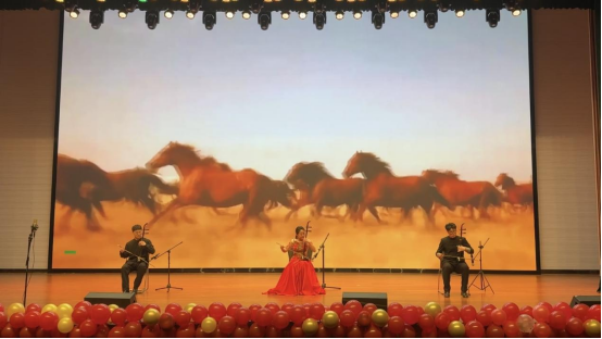 乐器表演震撼人心。由张一可老师及王宇、曹磊两位同学带来的二胡演奏《万马奔腾》,二胡独特的音色在演奏者手臂的一张一合下奔腾而出,仿佛千军万马呼啸而来,现场观众无不为之震撼,沉浸在这磅礴的气势之中。
